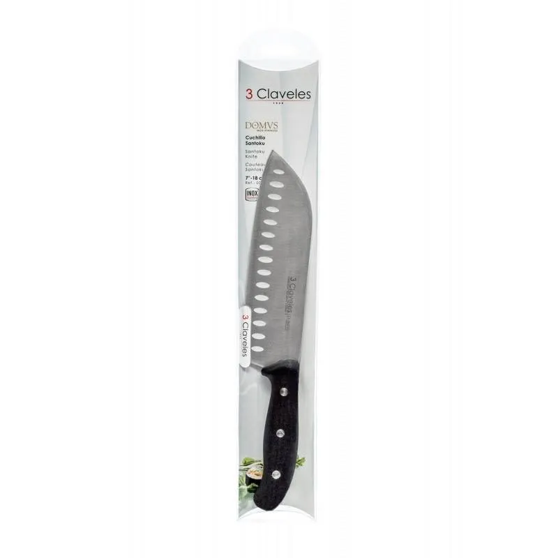 Set de 3 cuchillos de cocina de la línea domvs para profesionales y amateurs Cuchillo de verduras: ideal para limpiar, pelar o cortar frutas y verduras Cuchillo de cocina: hoja ancha y filo liso para todo tipo de alimentos Cuchillo santoku: hoja ancha y extra afilada, ideal para carne y pescado Medidas: cuchillo de verduras de 4, 5″-11 cm, cuchillo de cocina de 6″-15 cm y cuchillo santoku de 7″-18cm Material: acero inoxidable. Descripción del producto: Este Set de Cuchillos de la Línea Domvs está formado por los más esenciales de la cocina, cortar pequeñas frutas, picar verduras o incluso limpiar y cortar carnes. El cuchillo de verduras, es el más pequeño, para picar, pelar pequeños alimentos. El cuchillo de Cocina es el básico de los profesionales y cocineros aficionados para cortar y picar las verduras. El cuchillo Santoku es el multiusos de la cocina asiática, de hoja ancha y afilada para preparar carne, pescado y verdura. Contenido del set:: Cuchillo de verduras 11 cm Cuchillo de Cocina 15 cm Cuchillo Santoku 18cm Características: Cuchillo de Verduras: de hoja fuerte, filo liso y punta estable para cortar, limpiar y pelar pequeñas frutas y verduras. Cuchillo de Cocina: cuchillo de hoja ancha, filo liso, estable y fuerte para limpiar, cortar y picar verduras. Cuchillo Santoku: de hoja ancha y muy afilada para preparar carne, pescado y verdura. Materiales: Cuchillo de Verduras: Acero Inoxidable con mango de Polipropileno y acabado Pulido Mate. Cuchillo de Cocina: Acero Inoxidable con mango de Polipropileno y acabado Pulido Mate. Cuchillo Santoku: Acero Inoxidable con mango de Polipropileno y acabado Pulido Mate. La hoja alveolada crea cámara de aire entre la hoja y el alimento evitando que se quede adherido a la hoja. 3 Claveles tradición, prestigio y calidad profesional desde 1930.
