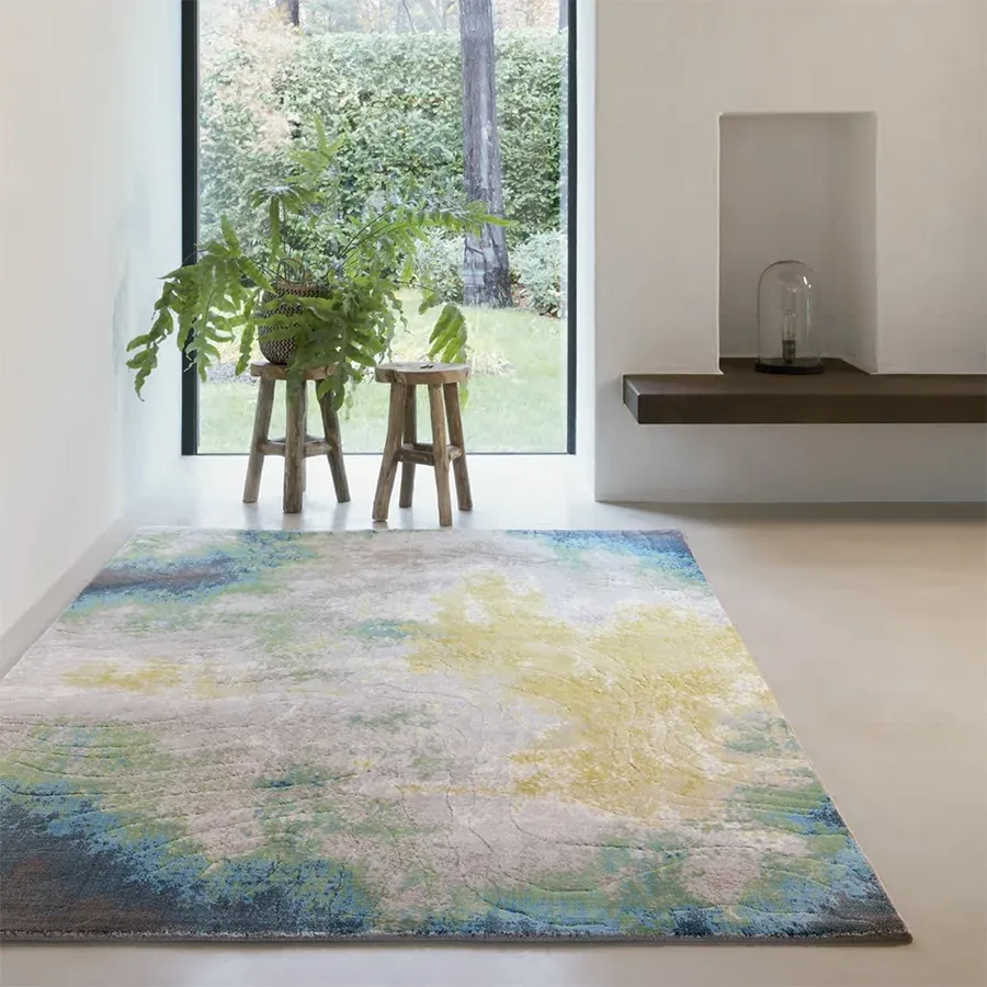 Alfombra con diseño abstracto en color azul y ocre realizada en polyester y decolán con textura suave y mullida, similar a la lana.