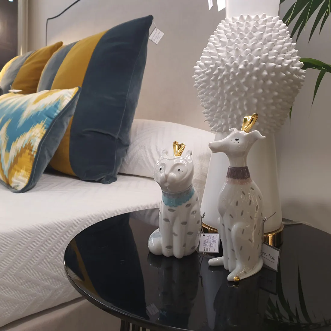 Figura de porcelana de divertido gato de estilo contemporáneo, que forma una inesperada pareja con un simpático galgo.