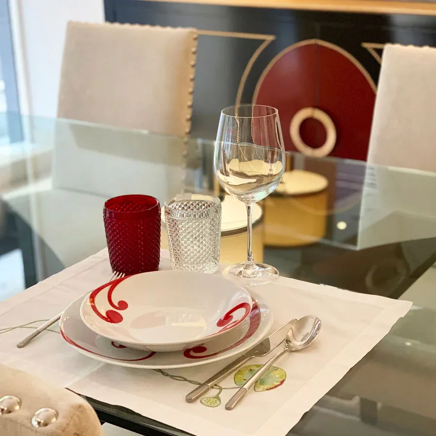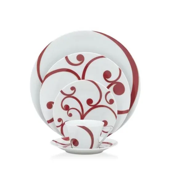 ¡Mi vajilla favorita! La mejor porcelana de Philippe Deshoulieres con un atrevido color rojo, ¡que destaca mogollón!