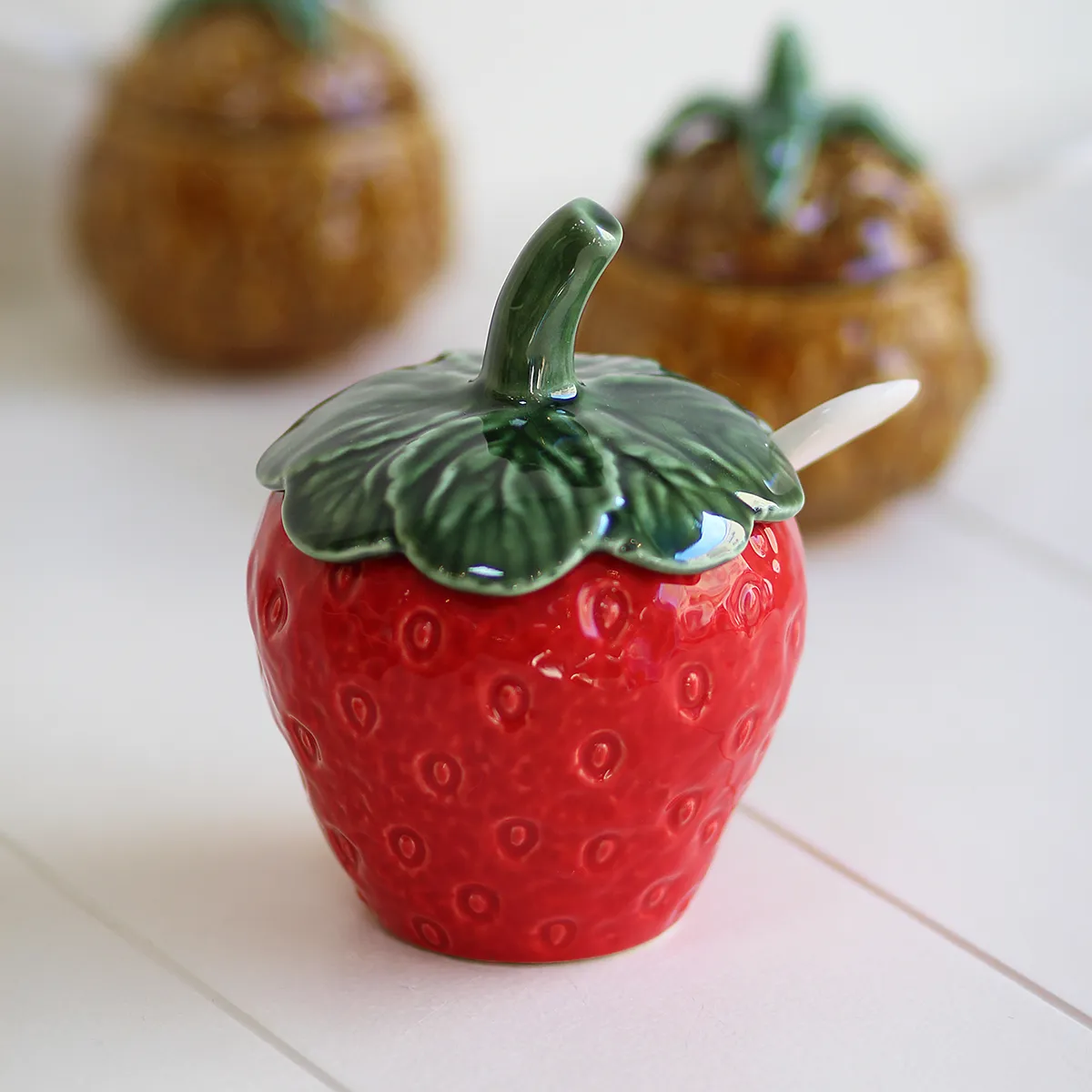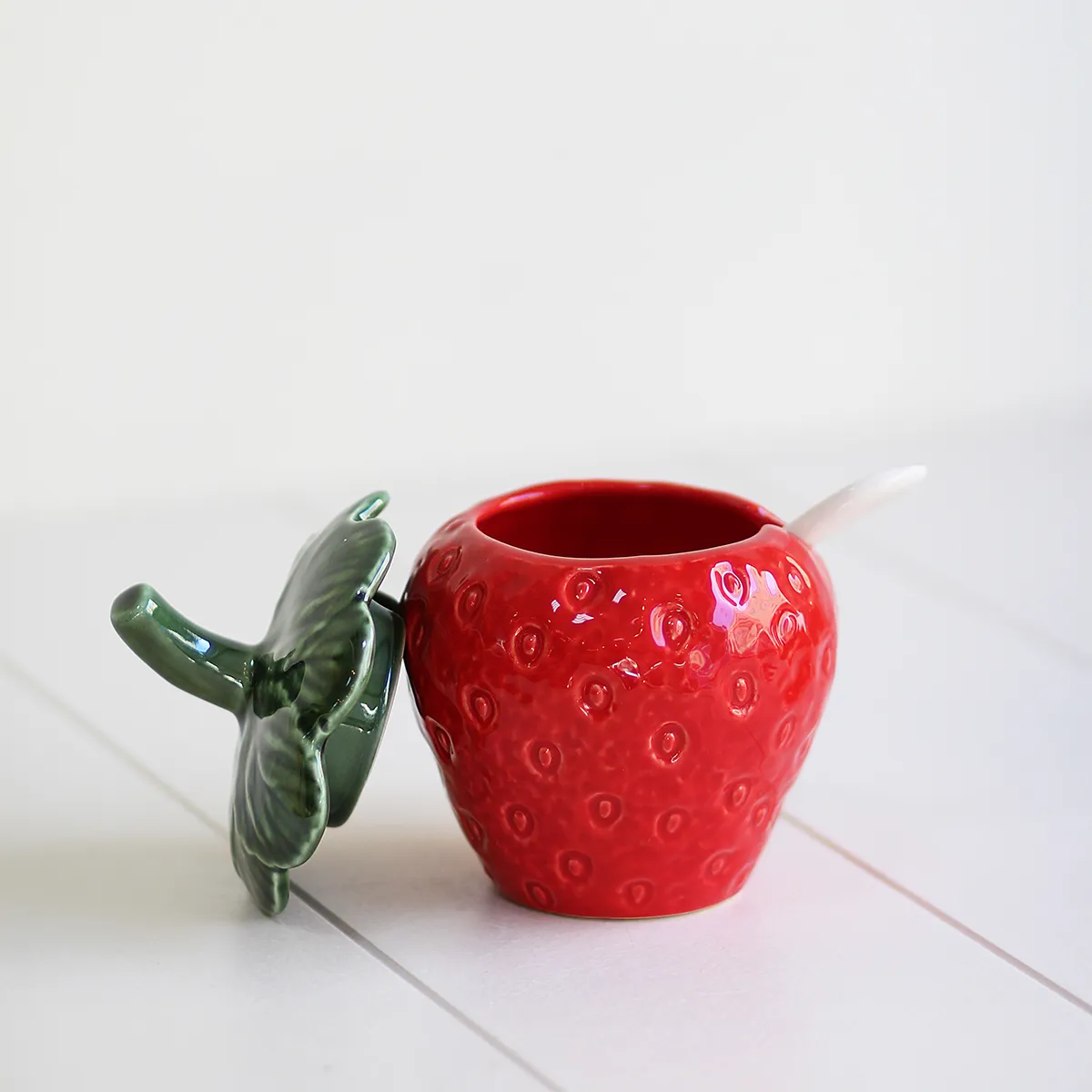 Este azucarero forma de fresa parte de un tipo de cerámica tradicional del centro de Portugal. Frutas, hortalizas y hojas son uno de los temas principales de la tradición lusa a la hora de montar una mesa. Está fabricada de manera artesanal y esmaltada a mano. Aunque el proceso de fabricación sea tradicional está adaptado para el uso diario.