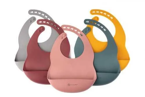 Babero de silicona con bolsillo frontal para recogida de alimentos y líquidos.