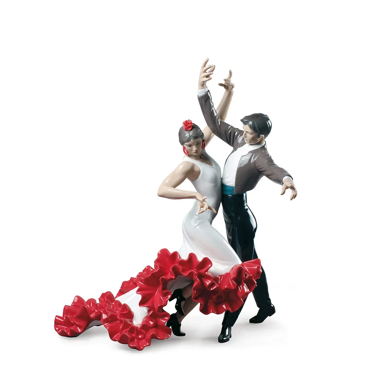 En esta pieza es tan protagonista la expresión y movimiento de los brazos y manos de los bailaores, como la forma en que la mujer mueve la larga cola de su espectacular traje. Con un acabado porcelana brillo, el peinado de la mujer está adornado con una rosa de color rojo a juego con los pendientes y los volantes de la bata de cola.