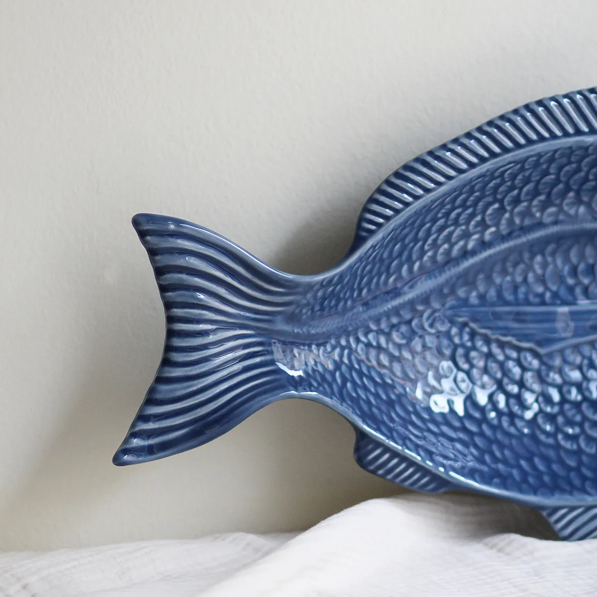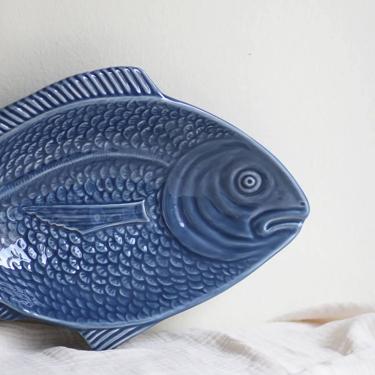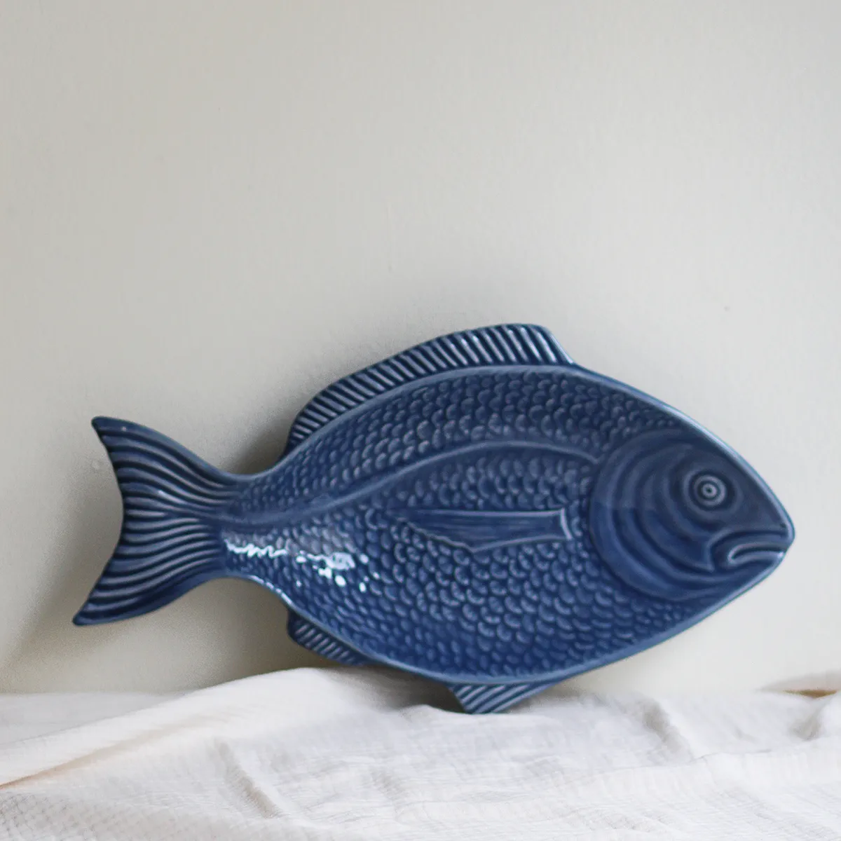 Bandeja con forma de pez, fabricado y esmaltado a mano en Portugal. Este tipo de vajilla con formas es ya un símbolo tradicional del país luso y el tema marítimo está muy presente en sus mesas. Aunque está elaborada de forma artesanal, se trata de un producto adaptado y fabricado para el uso diario.