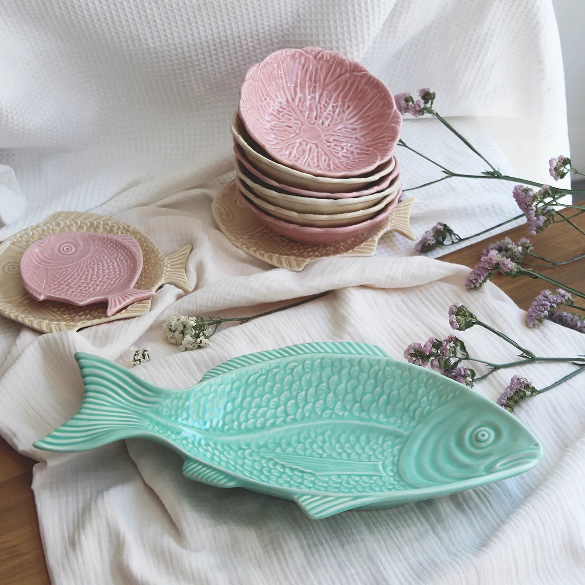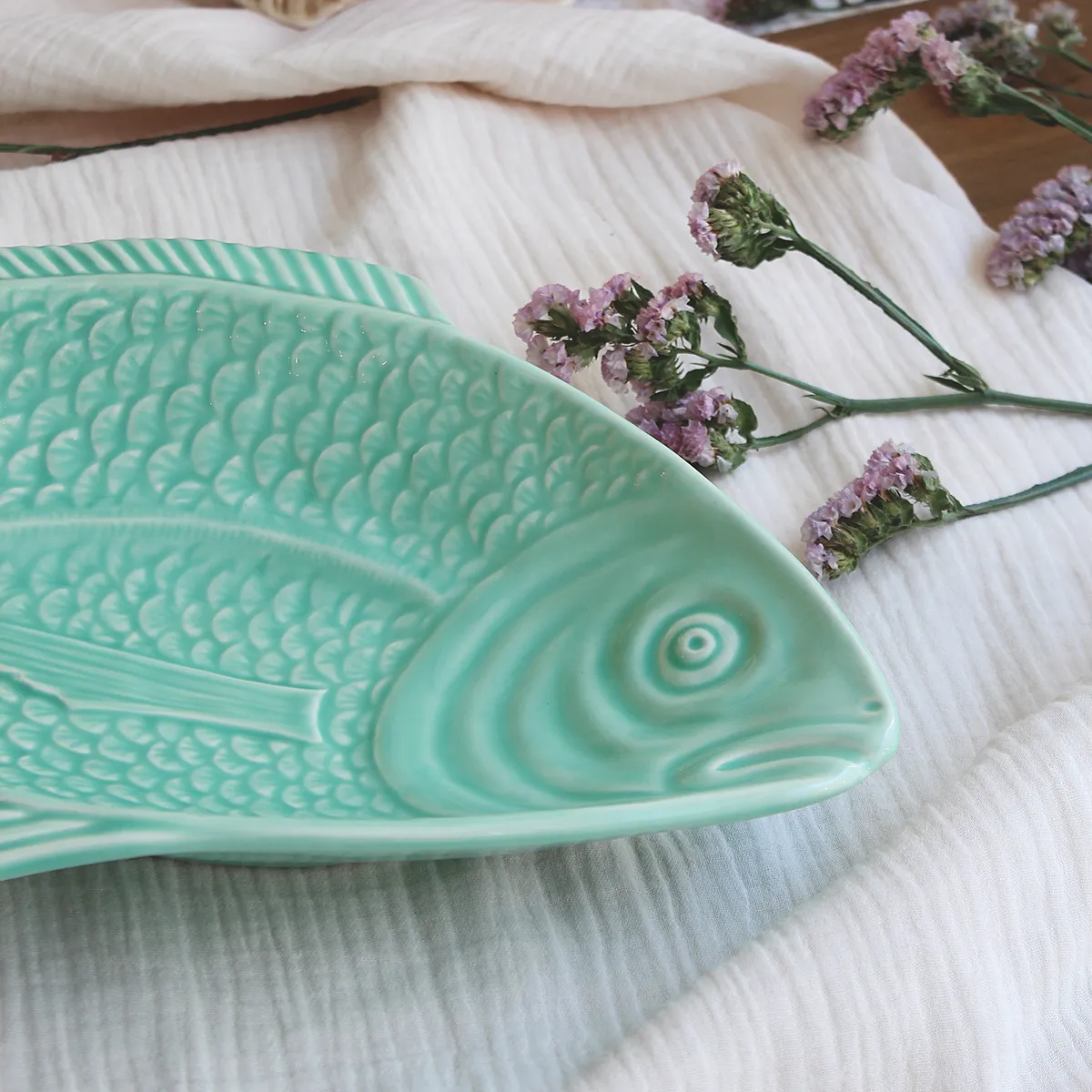 Bandeja con forma de pez, fabricado y esmaltado a mano en Portugal. Este tipo de vajilla con formas es ya un símbolo tradicional del país luso y el tema marítimo está muy presente en sus mesas. Aunque está elaborada de forma artesanal, se trata de un producto adaptado y fabricado para el uso diario.