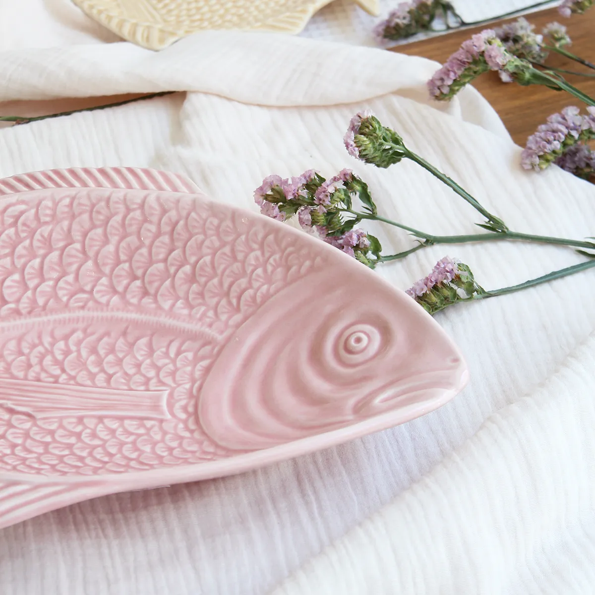 Bandeja con forma de pez, fabricado y esmaltado a mano en Portugal. Este tipo de vajilla con formas es ya un símbolo tradicional del país luso y el tema marítimo está muy presente en sus mesas. Aunque está elaborada de forma artesanal, se trata de un producto adaptado y fabricado para el uso diario.