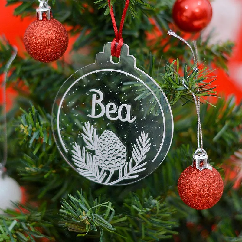 Sorprende a tus seres queridos, familiares y amigos con nuestra bola de Navidad personalizada efecto nieve con piñas en acrílico transparente o espejo, con el nombre grabado en su interior.