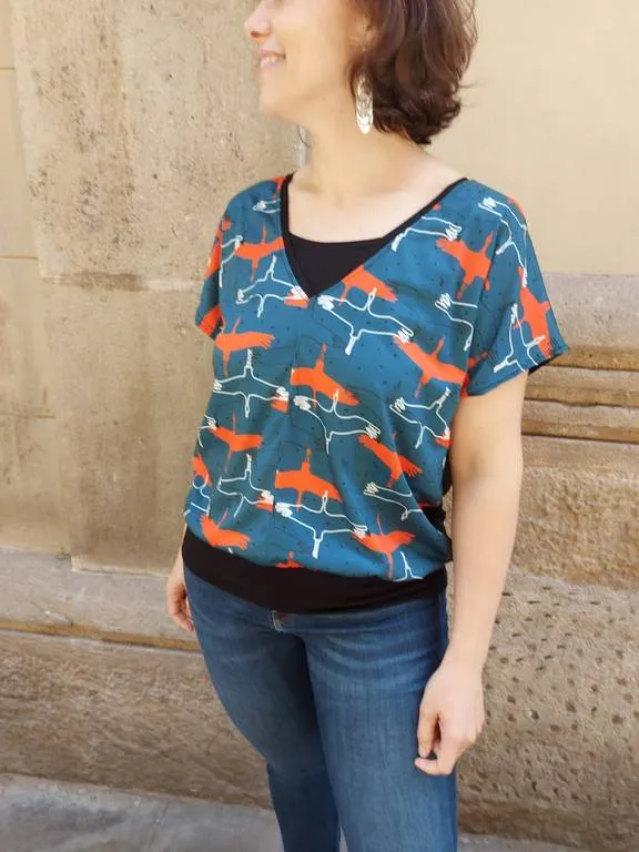 Top hecho de viscosa y tejido estampado, amplio, con cuello V en delantero y espalda.