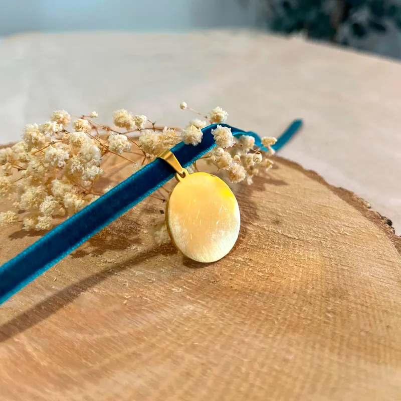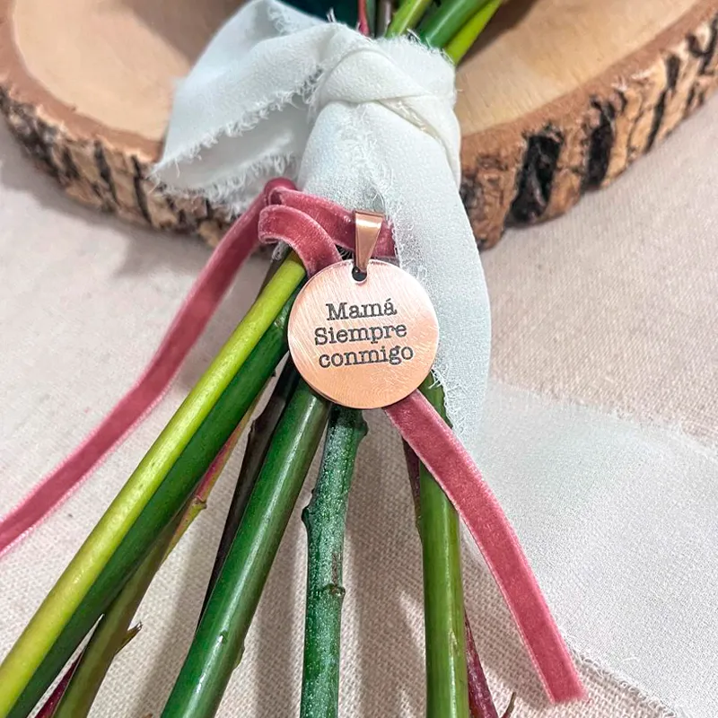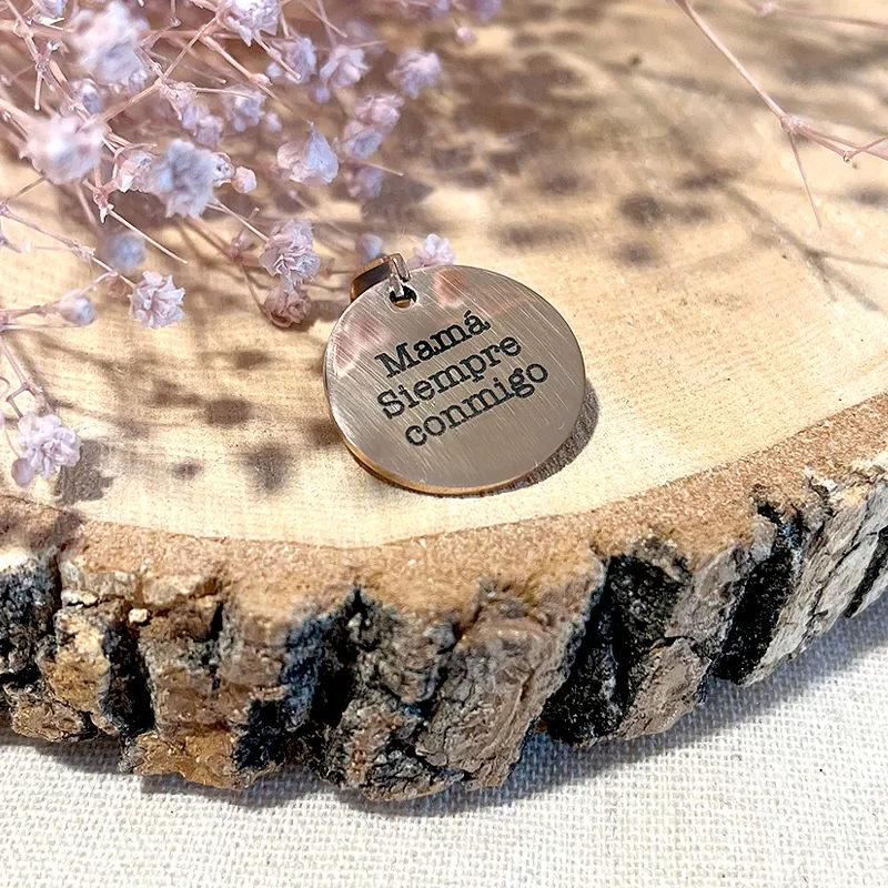 Están fabricadas en acero inoxidable y disponibles en color dorado y oro rosa. Disponible opción con lazo de terciopelo de 30cm de largo disponible en 4 colores o sin lazo, solo la chapita suelta.