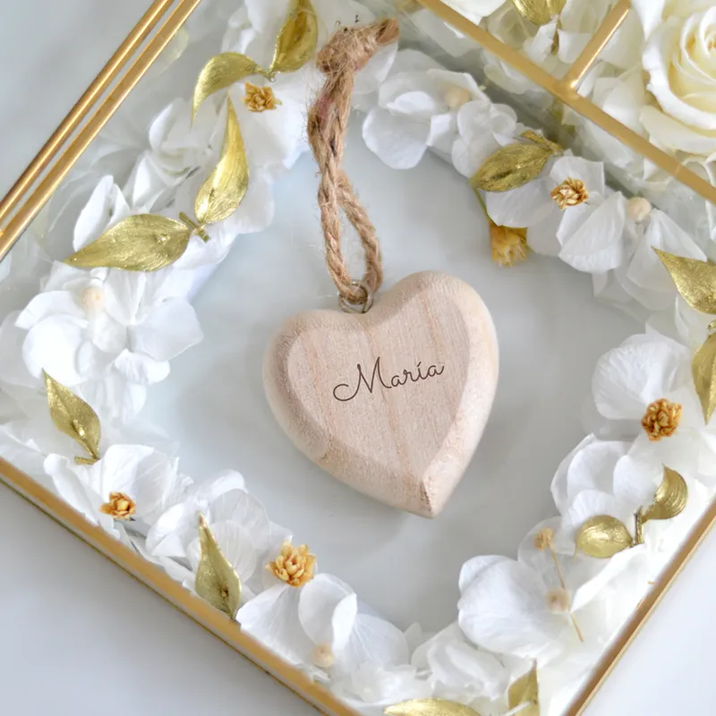 Corazón de madera natural macizo personalizado con el contenido que quieras grabado: un nombre, inicial, fecha… lo que más te guste y sin mínimo de unidades, la grabación es libre a medida del cliente. Se pueden personalizar todos iguales o diferentes.