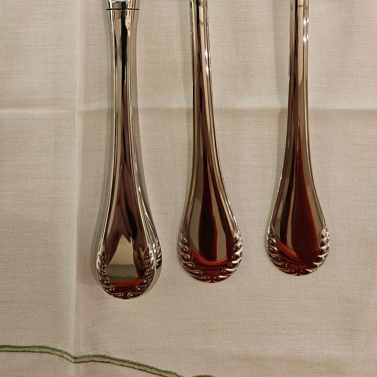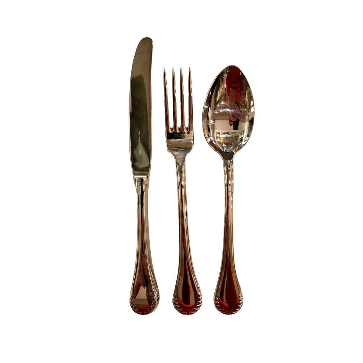 Cubertería de acero Nudos de 117 piezas con la siguiente composición: 12 cucharas, 12 cuchillos, 12 tenedores, 12 tenedores para pescado, 12 palas para pescado, 12 cucharillas de postre, 12 cuchillos de postre, 12 tenedores de postre, 12 cucharillas de cafe, 1 cazo, tenedor para servir, cuchara para servir, pala para tarta y cazo para salsa.