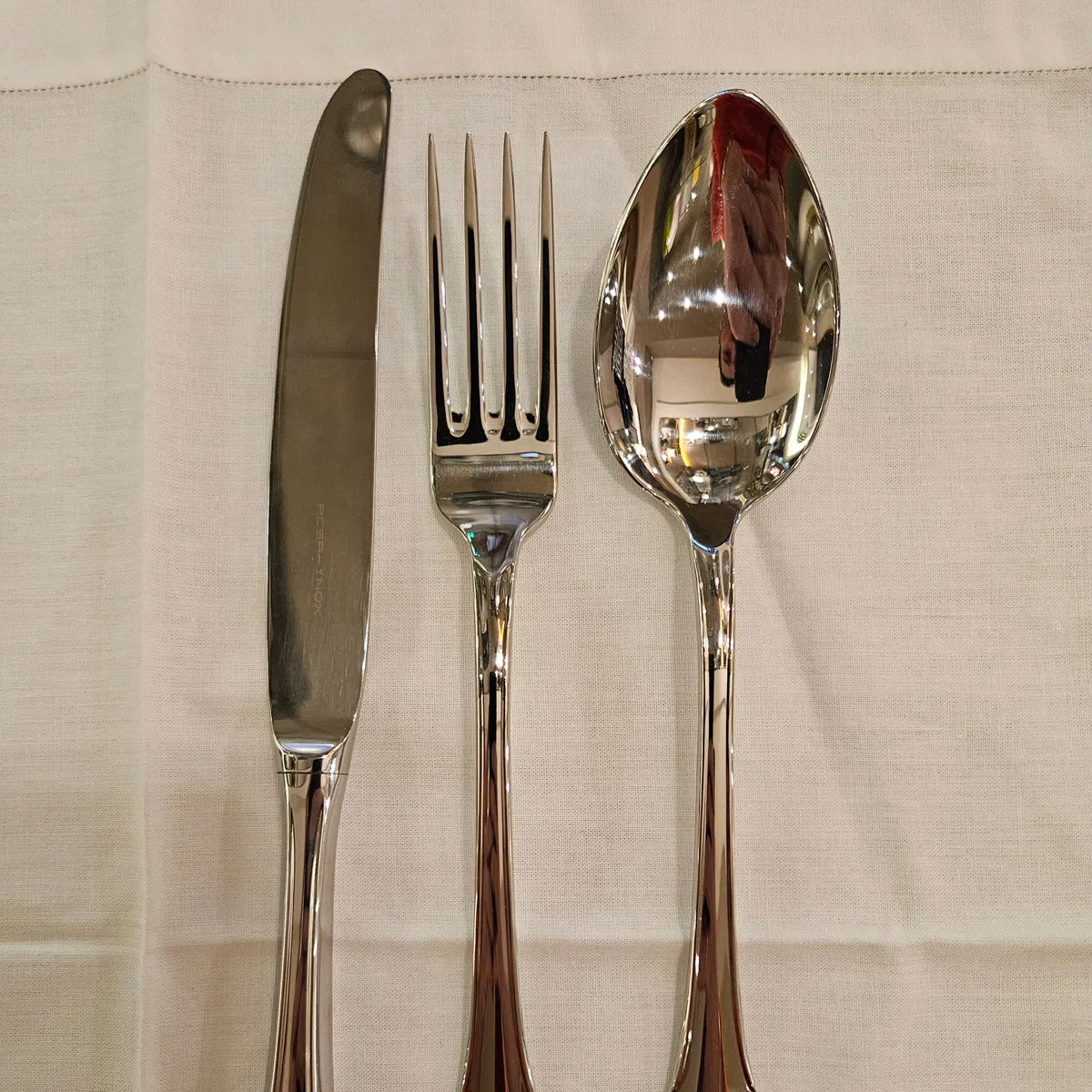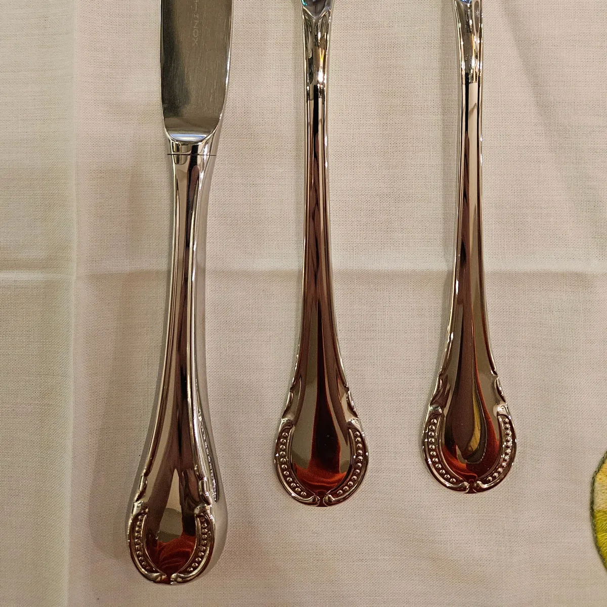 Cubertería de acero Puntos de 117 piezas con la siguiente composición: 12 cucharas, 12 cuchillos, 12 tenedores, 12 tenedores para pescado, 12 palas para pescado, 12 cucharillas de postre, 12 cuchillos de postre, 12 tenedores de postre, 12 cucharillas de cafe, 1 cazo, tenedor para servir, cuchara para servir, pala para tarta y cazo para salsa.