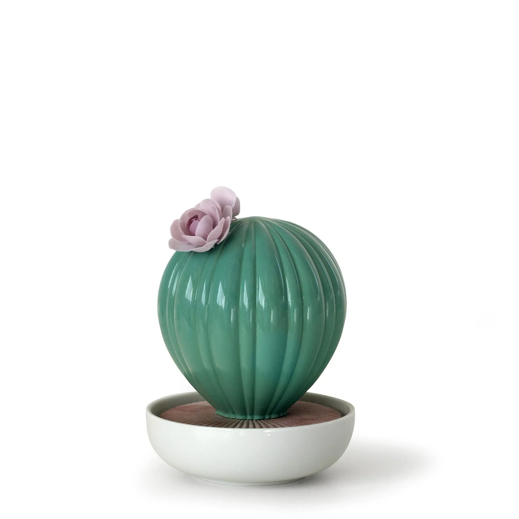 Este difusor líquido está realizado enteramente con elementos cerámicos. Combina un elemento de porcelana con acabado brillo que representa una planta de cactus con su flor, compuesta por 26 pétalos, y una base de cerámica impregnable para verter el aceite esencial que viene con el producto. La fragancia de este difusor es Jardines de Valencia, un aroma afrutado con pinceladas de bergamota, tuberosa y vainilla.