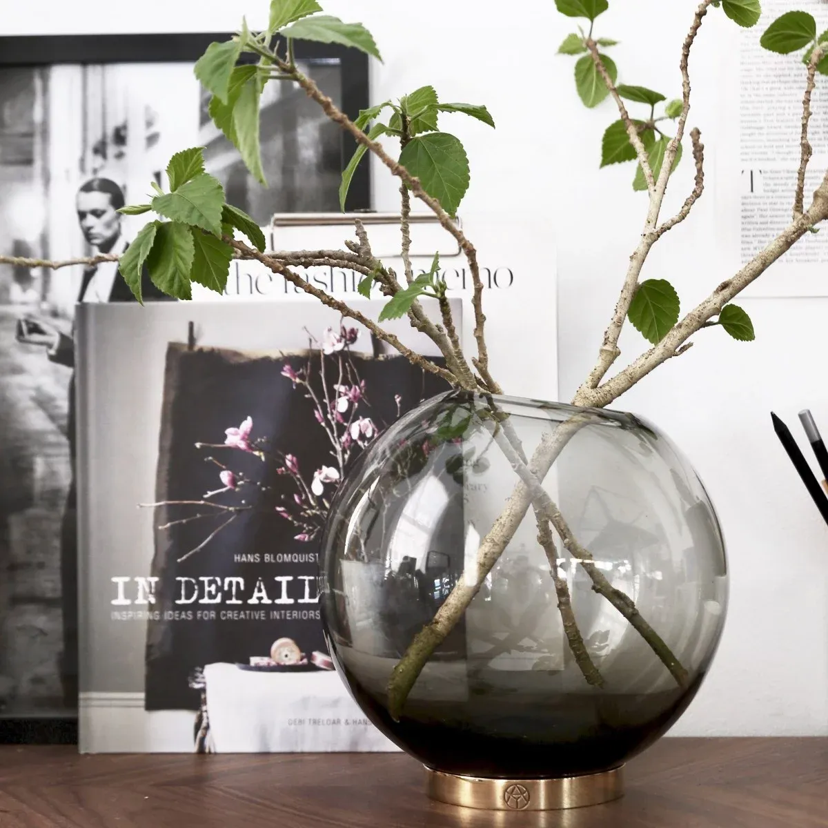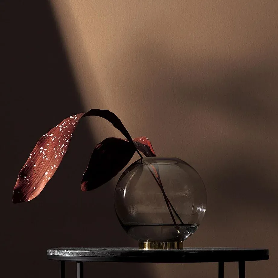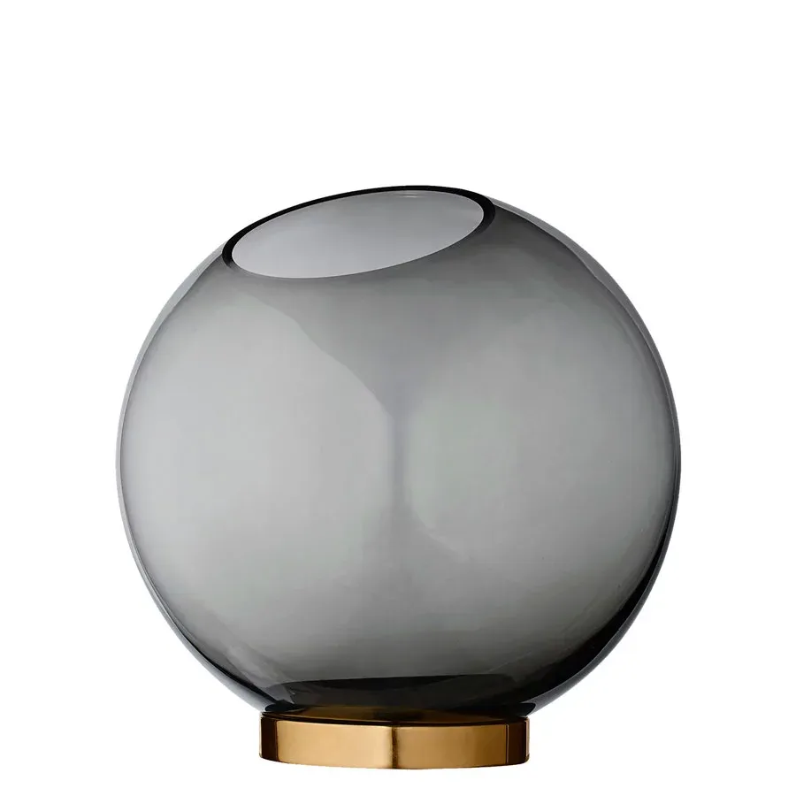 Una pieza esférica de cristal sobre un anillo de latón dorado. Utilízalo como jarrón para poner flores, una planta o simplemente como almacenaje.