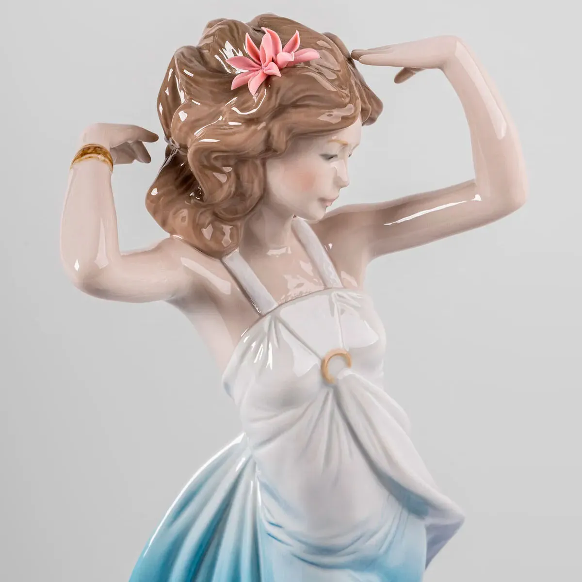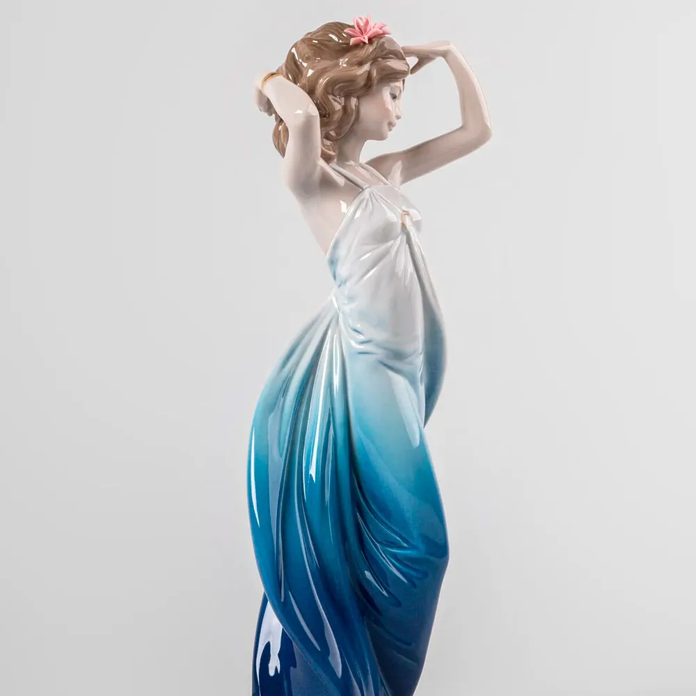 El diseño de su vestido, decorado con un degradado en azul que se extiende desde la base hasta la cintura, añade movimiento y profundidad visual, mientras que los delicados detalles de su expresión y postura resaltan su actitud natural.