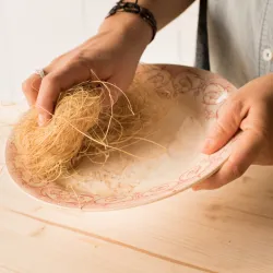 • El estropajo viene enrollado. Necesitas deshacerlo ligeramente, creando una especie de nido para adaptarlo a la forma de tu mano.