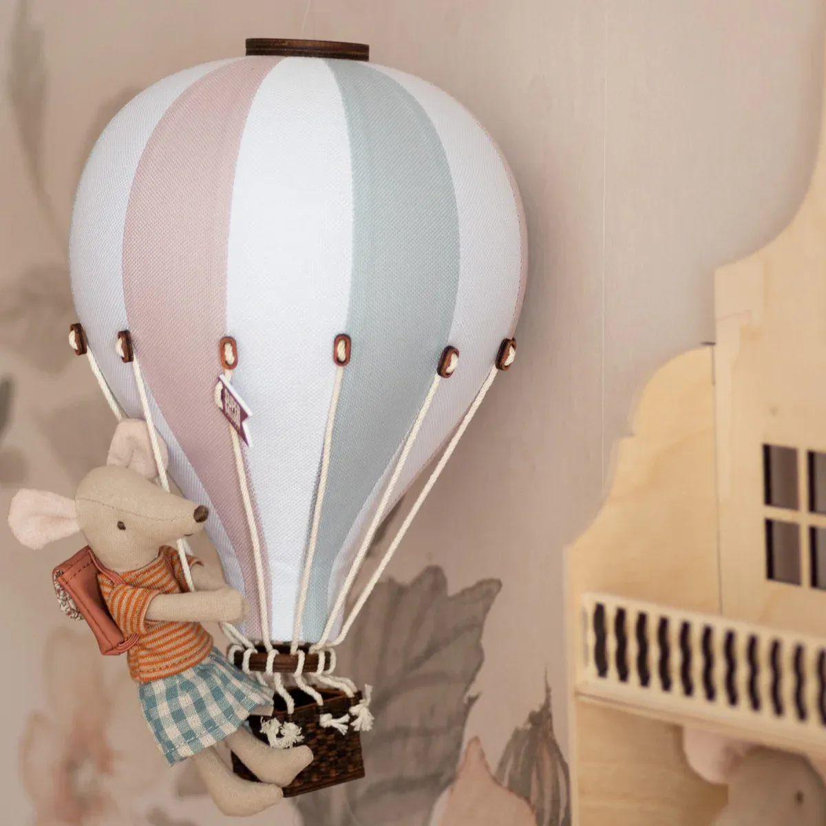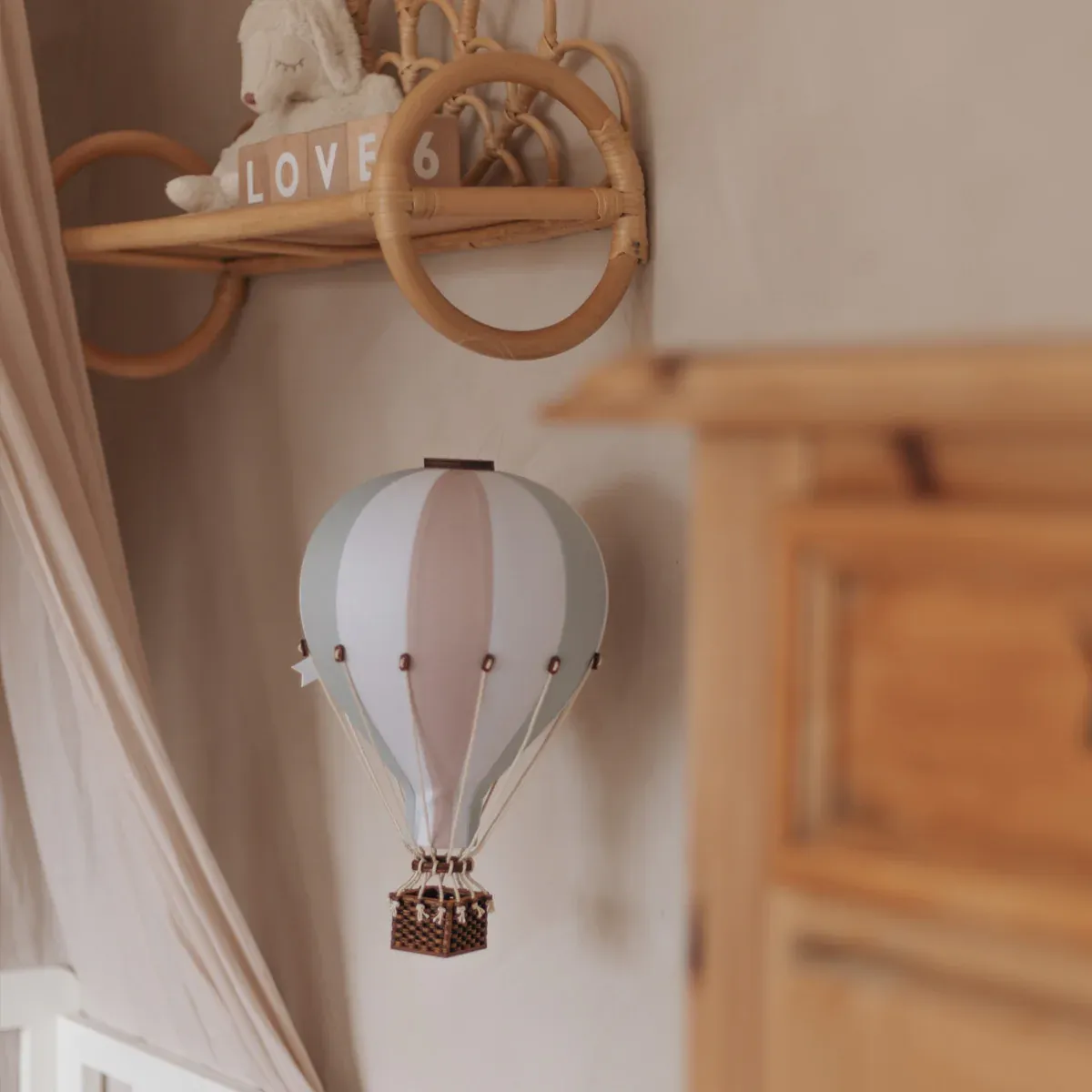 Nuestro globo aerostático colgante es el complemento perfecto para decorar la habitación de los niños. Este modelo, hecho con colores suaves de verde salvia, rosa empolvado y blanco roto, crea un ambiente alegre y que estimula la imaginación de los peques.