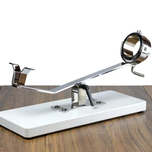 El cuerpo principal del jamonero Afinox Primus, está construido en acero puro, siendo una herramienta de corte sólida, bella, minimalista y muy funcional, única en su género. El jamonero puede balancearse de arriba abajo para cortar el jamón o exhibirlo. El sistema de cabezal giratorio –también de acero inoxidable– permite rotar el jamón sobre su eje. El tornillo de sujeción del jamón y los puntos de agarre situados en el cabezal crean un seguro y poderoso sistema que aporta gran firmeza al corte.