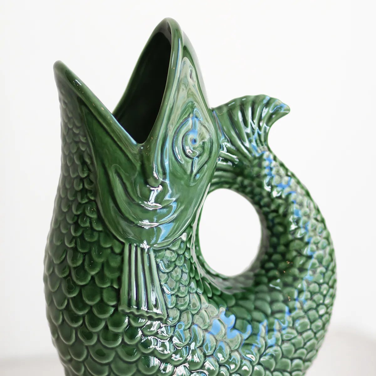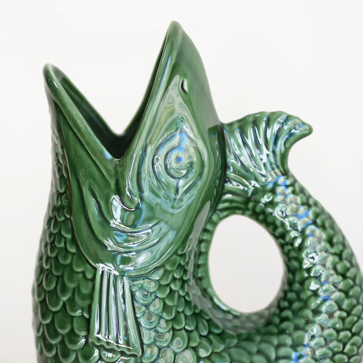 Jarra o florero con forma de pez, fabricada y esmaltada a mano en Portugal. Este tipo de vajilla con formas es ya un símbolo tradicional del país luso y el tema marítimo está muy presente en sus mesas.