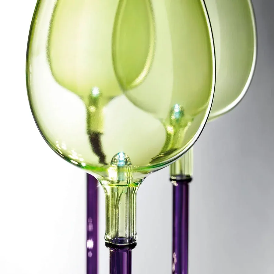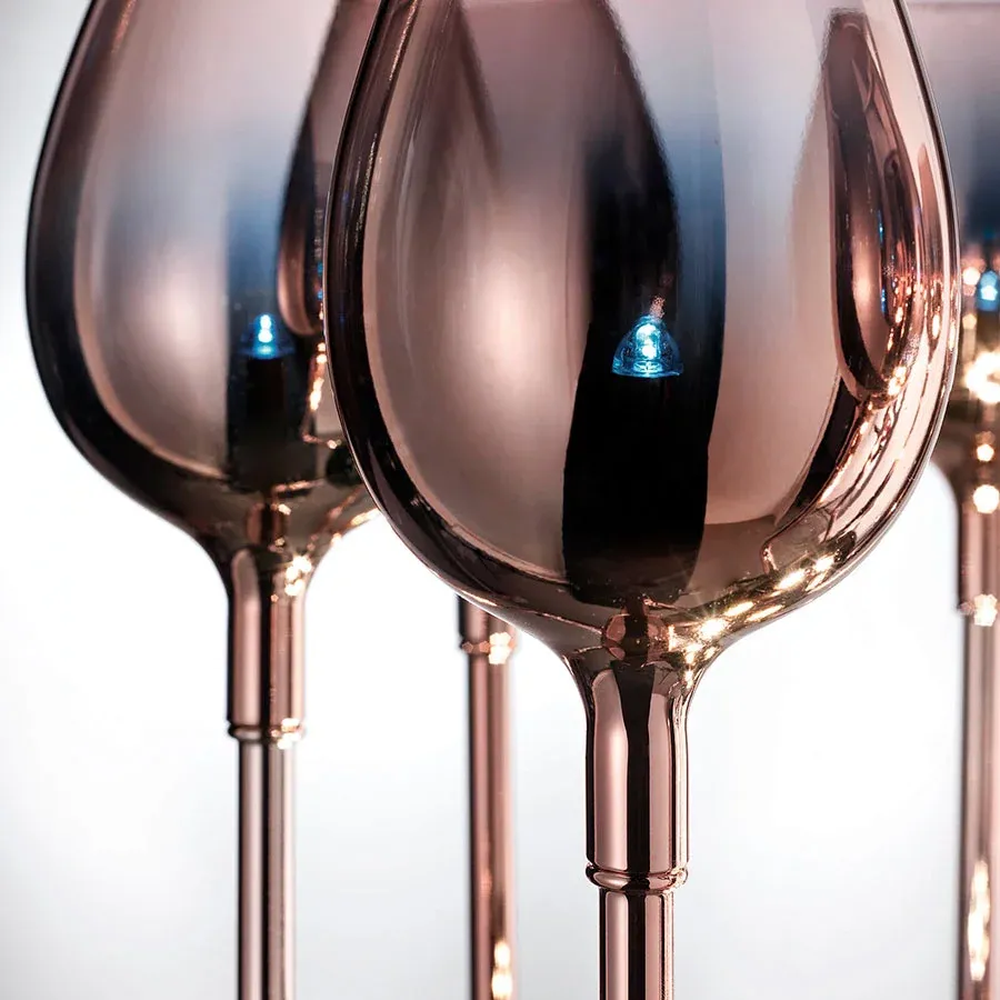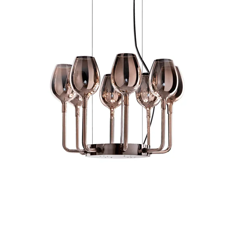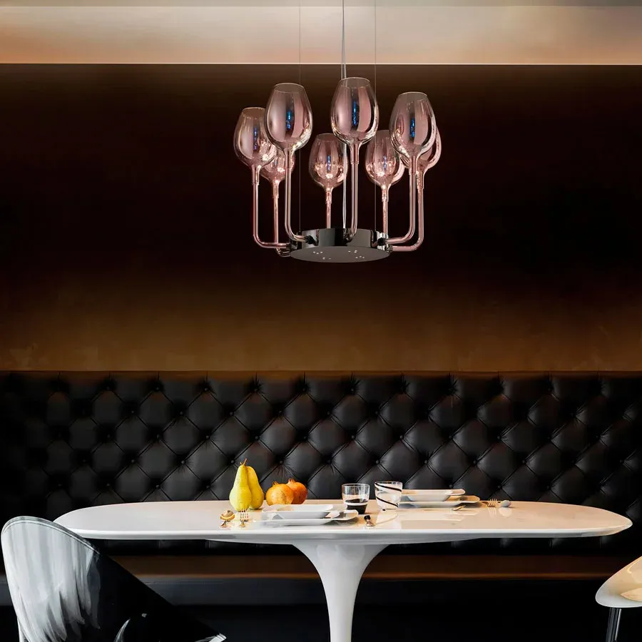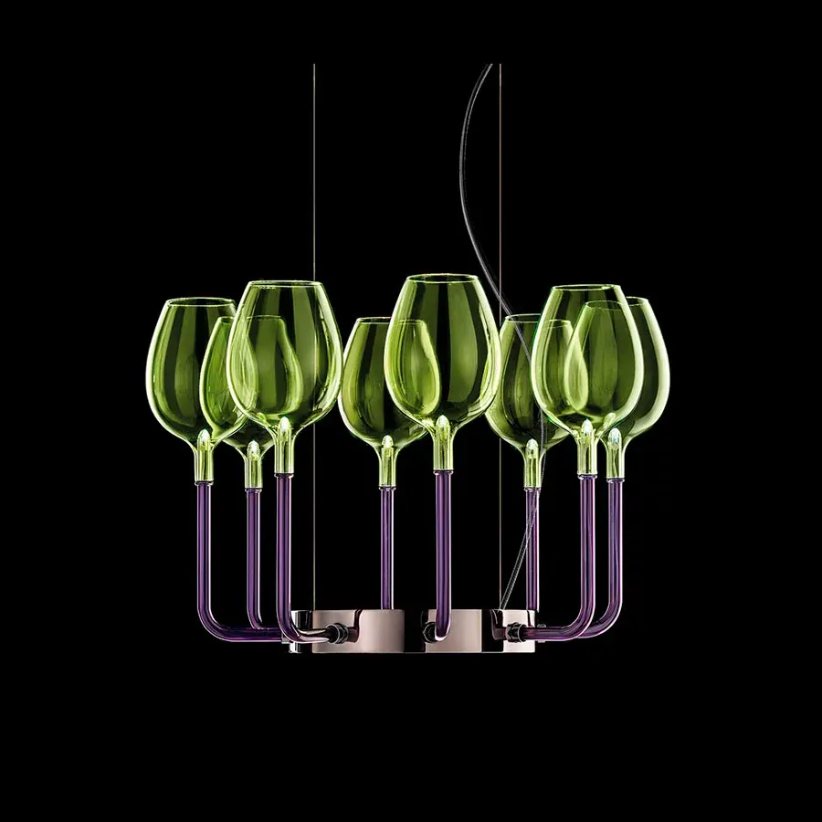 Un increible chandelier de 8 brazos de cristal italiano disponible en dos colores de cristal: oro rosa o un elegante degradado en morado y verde.