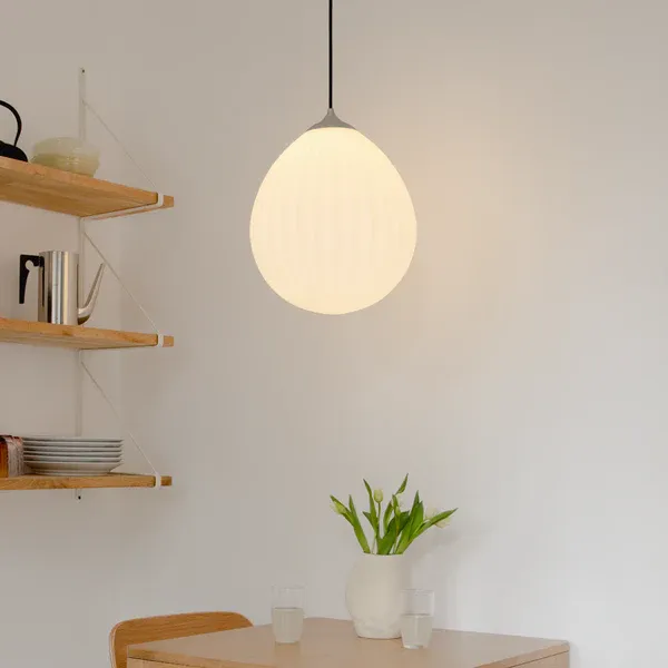 Elaborada con vidrio opalino y soporte con acabado en color blanco de la marca Umage. Compatible con bombillas E26/E27 de hasta 15W LED.