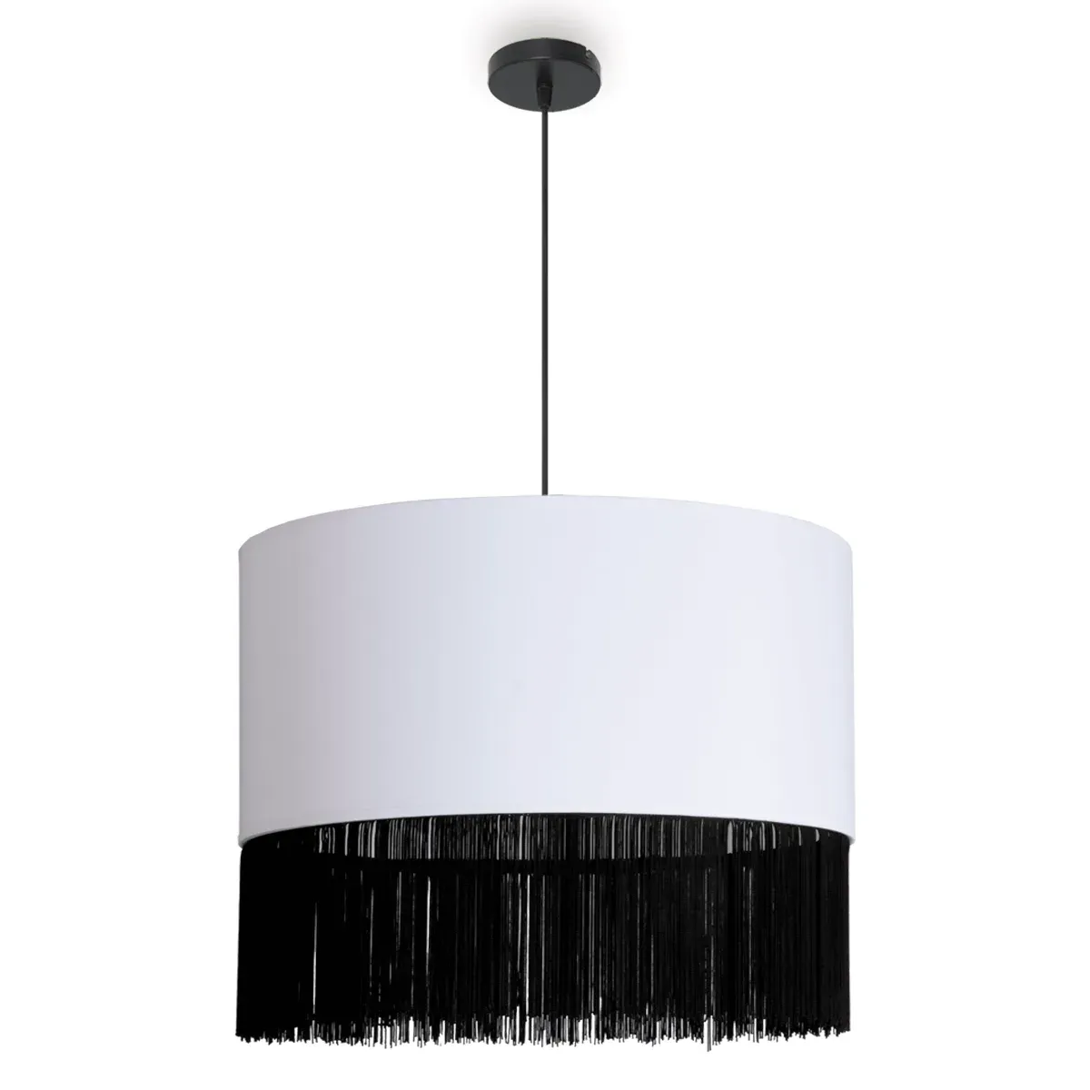 Introduce un elemento de diseño único y sofisticado en tu hogar con nuestra lámpara colgante con flecos. Disponible en elegante blanco o moderno negro, esta lámpara de techo se convierte en el centro de atención gracias a sus flecos largos y fluidos que crean un efecto visual cautivador y una atmósfera cálida y envolvente.