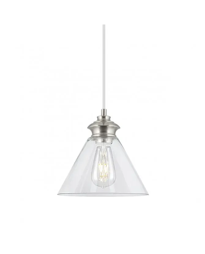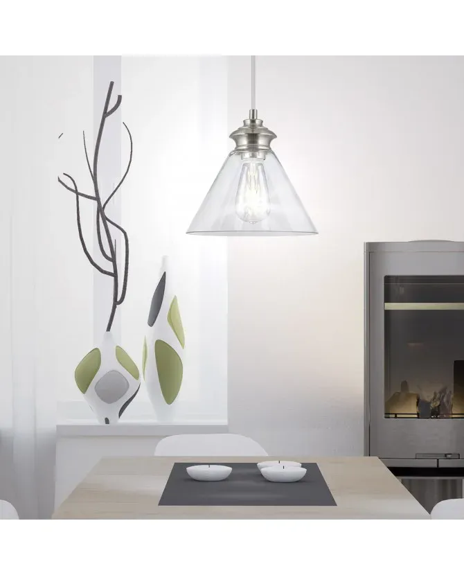 La lámpara colgante Keta en níquel satinado ofrece un diseño elegante y contemporáneo, perfecto para interiores modernos. Su pantalla de vidrio transparente en forma cónica permite una máxima difusión de la luz, resaltando la belleza de las bombillas de estilo vintage o LED. El acabado en níquel satinado aporta un toque sofisticado y atemporal, convirtiendo esta lámpara en una opción versátil para cocinas, comedores o salas de estar. El modelo Keta no solo proporciona una iluminación funcional, sino que también añade un elemento decorativo que complementa cualquier ambiente con un aire industrial chic.