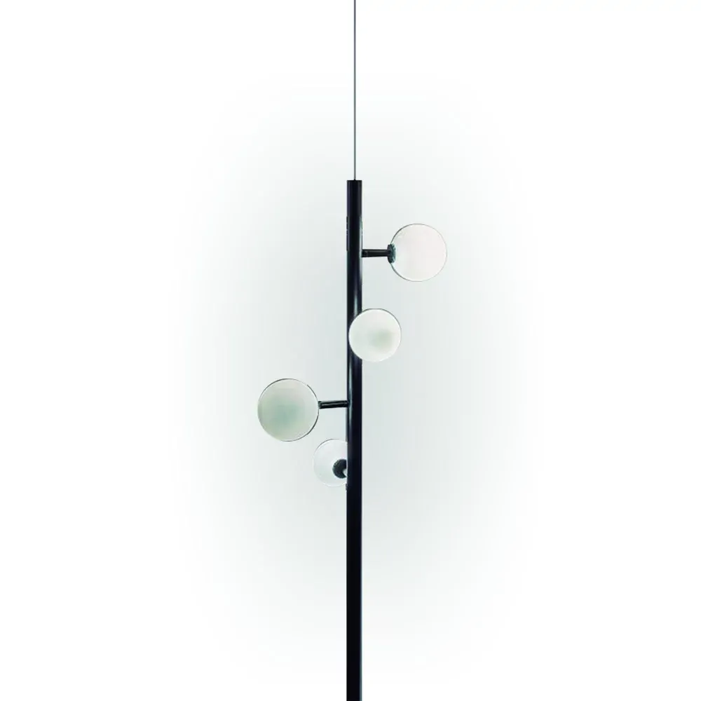 Lámpara colgante de metal negro con bolas de luz.
