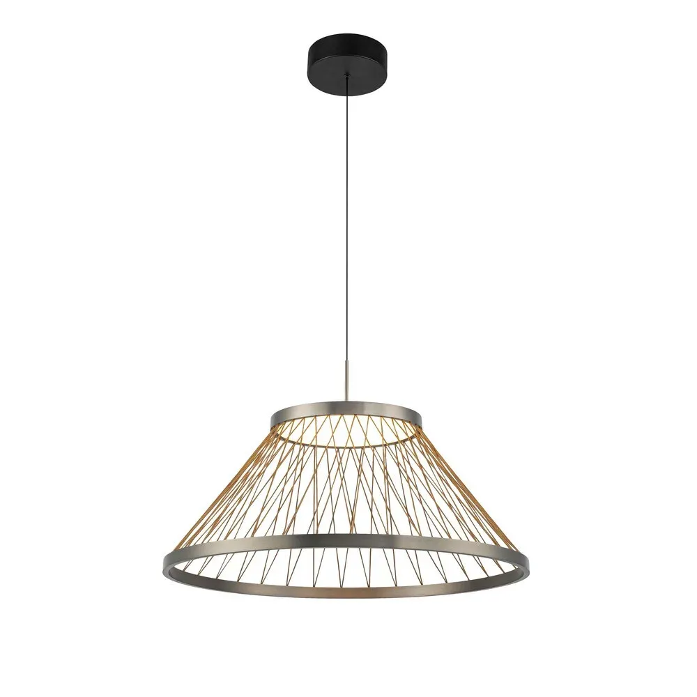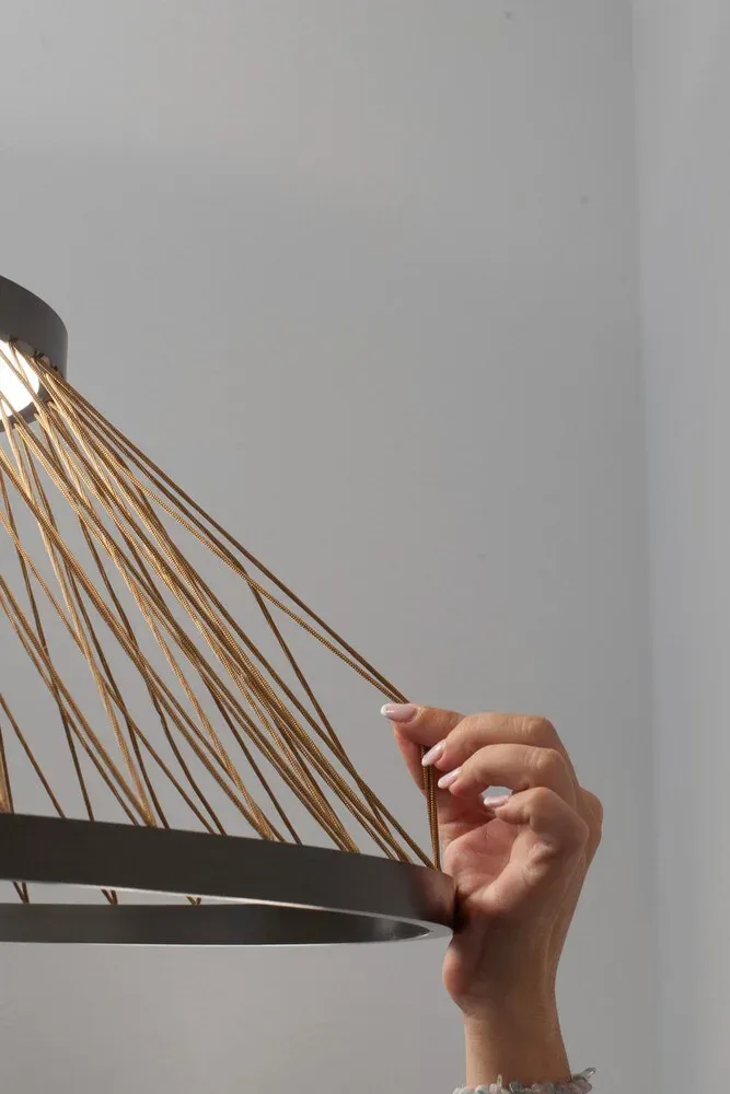 La lámpara colgante spider moderna de 40 o 60cm de diámetro es una pieza de diseño elegante y contemporáneo, perfecta para aportar un toque sofisticado a cualquier espacio. Su LED integrado de 20W o 43W según tamaño emite una cálida luz (3000ºK), creando un ambiente acogedor y agradable en salas de estar, comedores o dormitorios. El acabado en aluminio gris metal aporta un aire industrial, mientras que la cuerda dorada proporciona un contraste brillante y lujoso, ideal para resaltar la belleza de tu hogar u oficina.