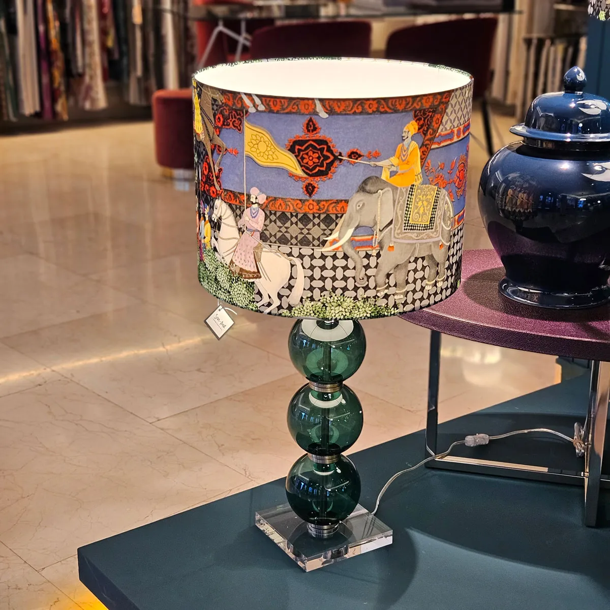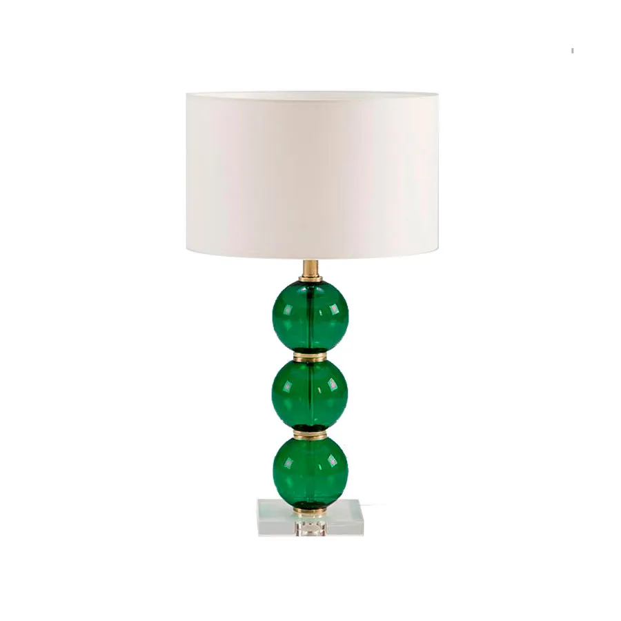 Pie de lámpara con bolas de cristal verde, base transparente y separadores dorados. El color del cristal puede variar respecto al de la foto.
