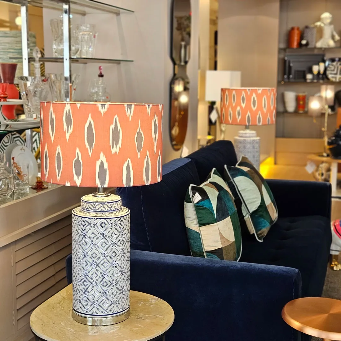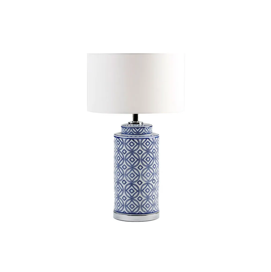 Lámpara de cerámica con fondo blanco y dibujo azul y detalles cromados.