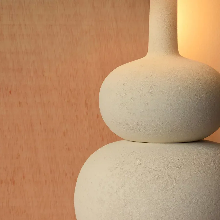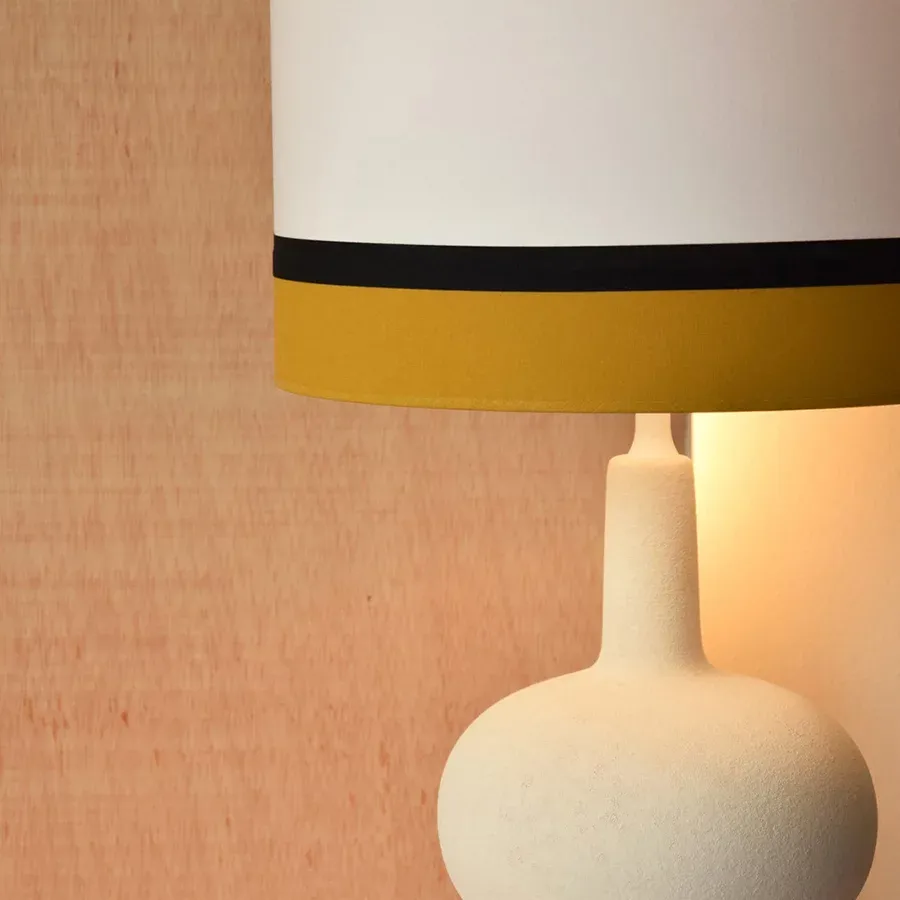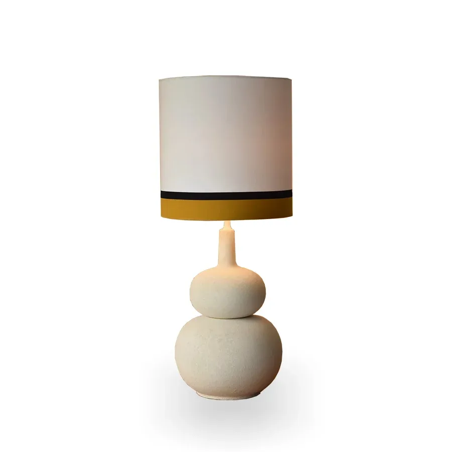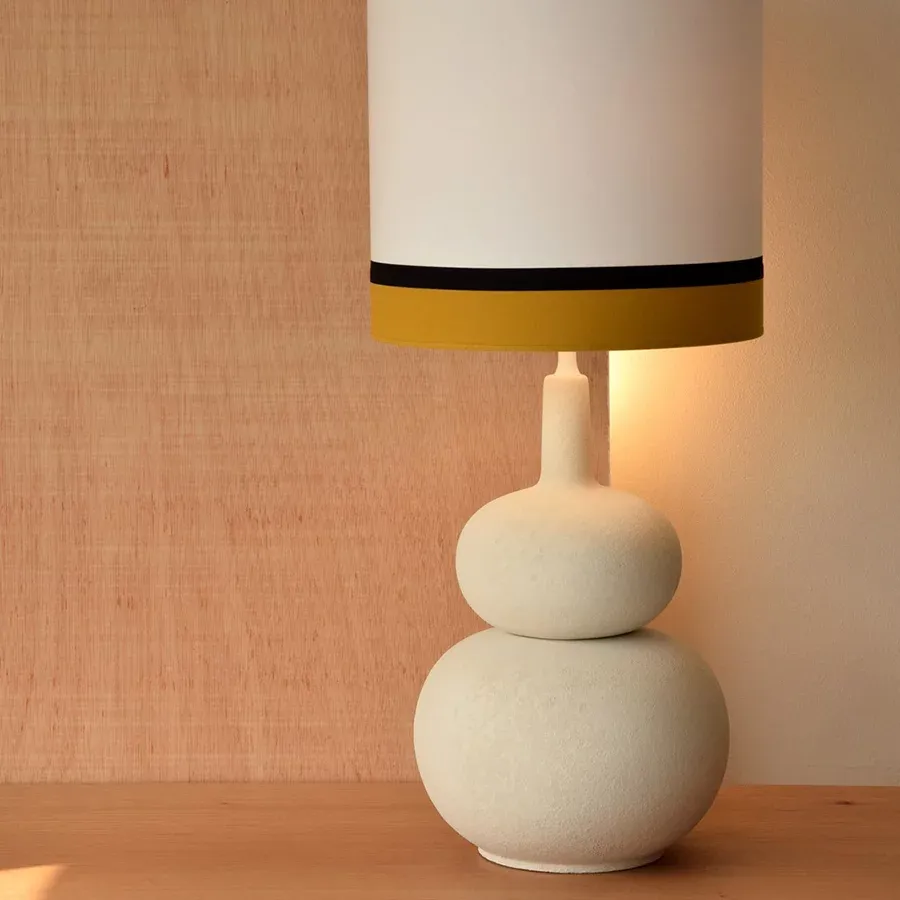 Lámpara de sobremesa de pasta de cerámica gris de textura rugosa y formas redondeadas. Pantalla de algodón blanco con franja inferior de 6 cms en color mostaza y unión en color negro.