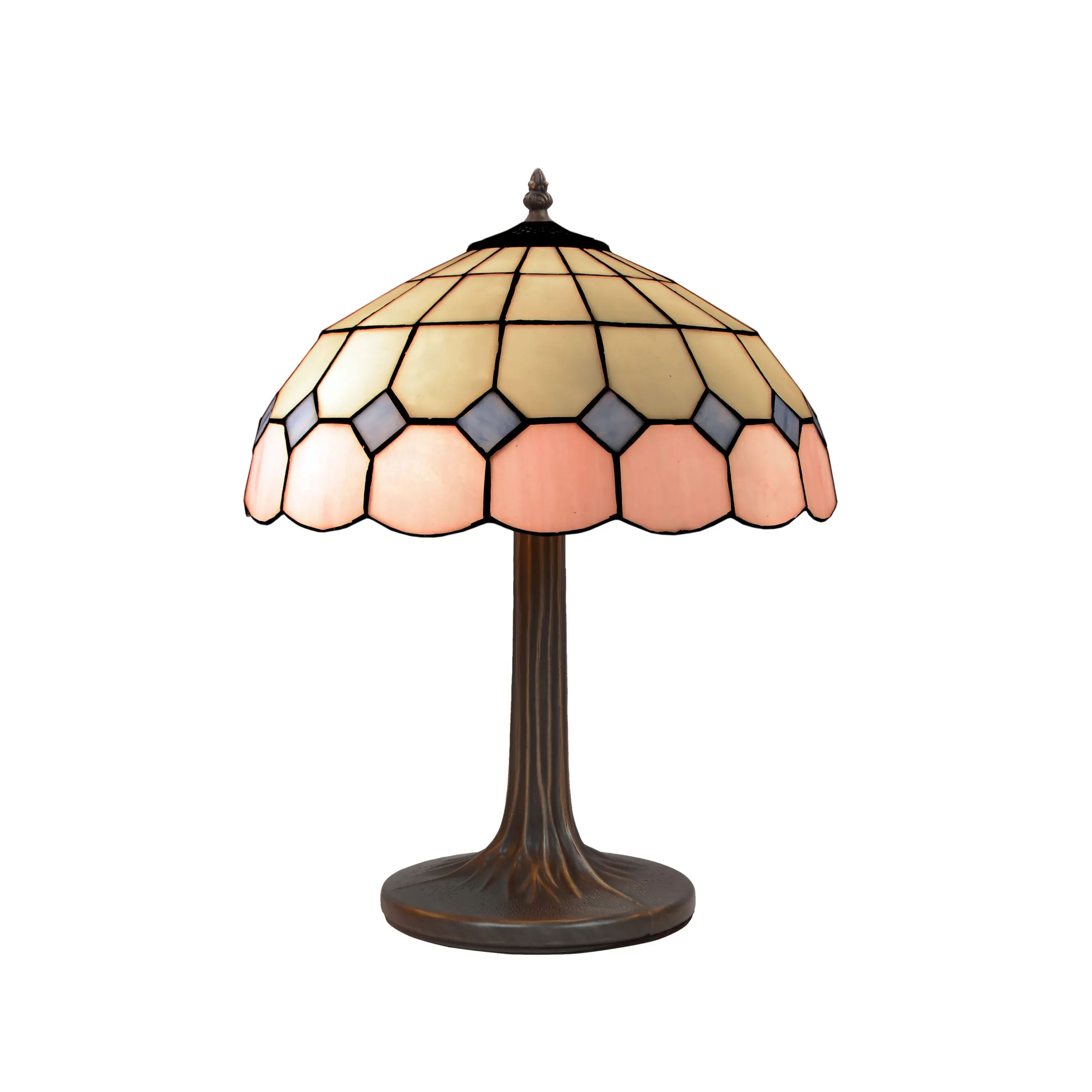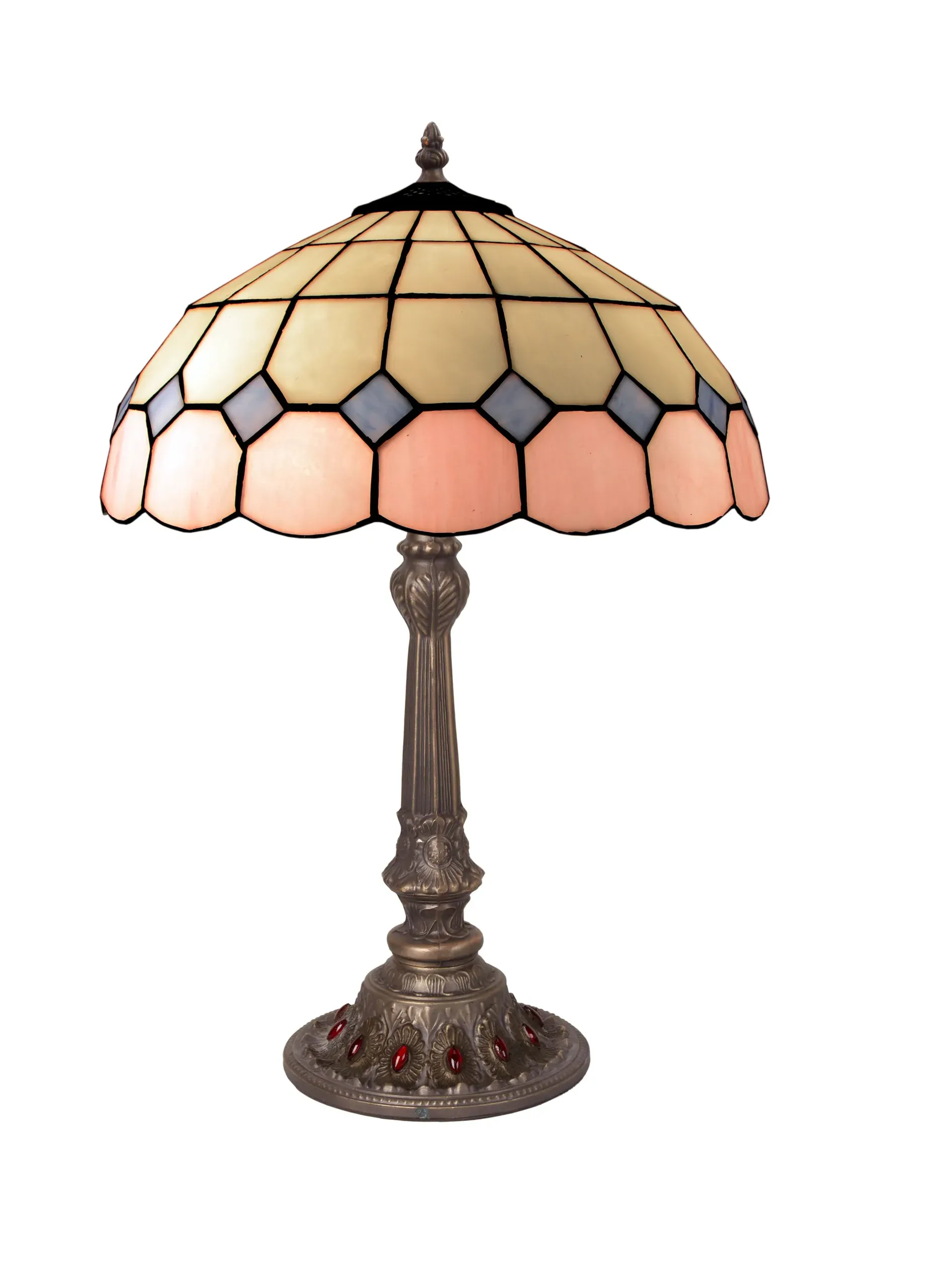 La lámpara de mesa Tiffany pink es una pieza de iluminación única que destaca por su diseño clásico y su belleza artesanal. Con una pantalla de vidrio en tonos pastel, esta lámpara es perfecta para añadir un toque de elegancia a cualquier estancia. La pantalla tiene un diámetro de 40 cm y está compuesta por vidrios de colores en patrones geométricos. La base de la lámpara es robusta, diseñada para proporcionar estabilidad y durabilidad. Esta lámpara es ideal para iluminar salones, dormitorios o espacios donde se busca crear un ambiente acogedor y cálido, gracias a su estilo atemporal y a la calidad de sus materiales. Todas las lámparas llevan un certificado de autenticidad con su número de serie, que garantiza la calidad en la fabricación.