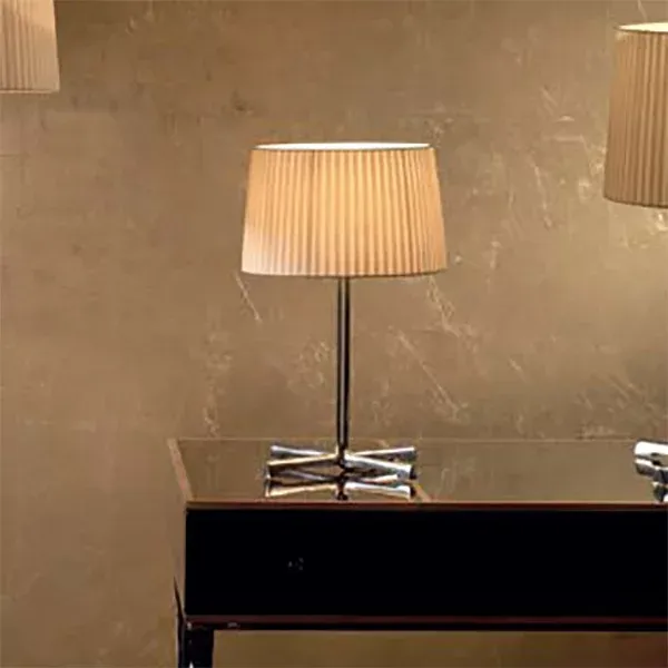 Una lámpara de sobremesa pequeña pero contundente de acero mate con pantalla cilíndrica de tela plisada blanca.