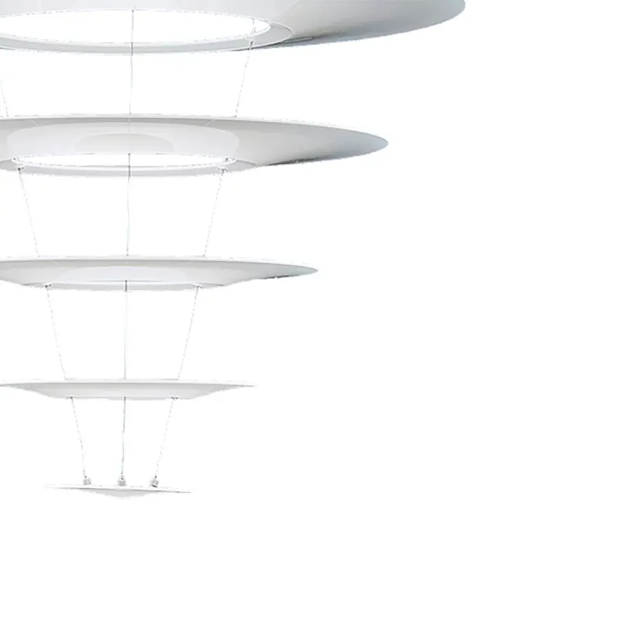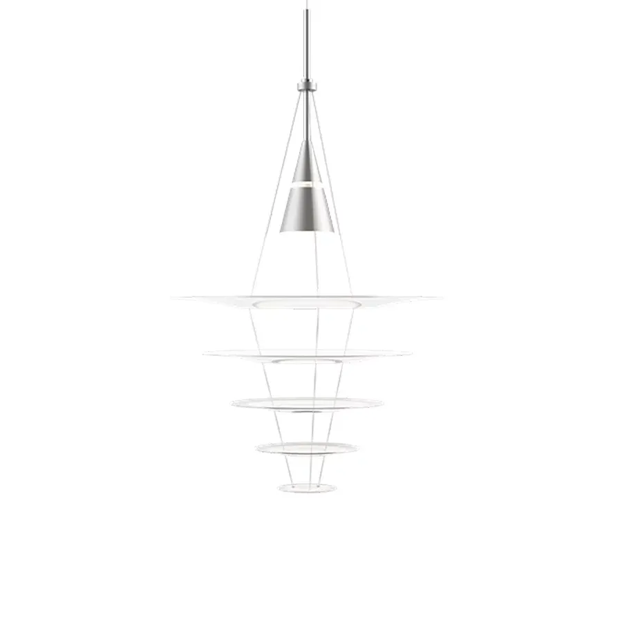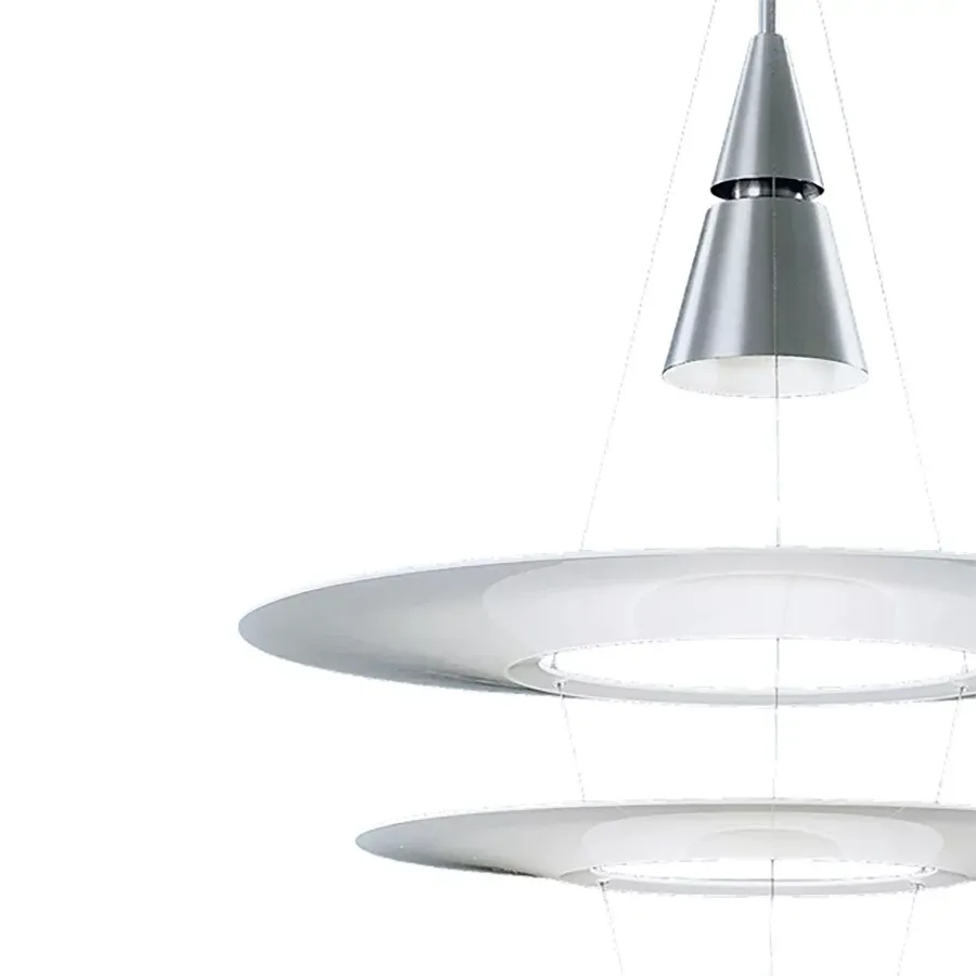 En 2007, el diseñador japonés Shoichi Uchiyama añadió a la familia Enigma un nuevo miembro: la Enigma 545. Enigma 545 es una versión más grande de la Enigma 425, con un diseño de pantallas flotantes que penden de unos hilos ultrafinos, aportándole una presencia transparente y ligera. La palabra «enigma» simboliza misterio, un guiño al efecto de las pantallas encendidas que, a cierta distancia, parecen levitar. El diseño encajaba a la perfección con la filosofía de producto de Louis Poulsen y daba un nuevo sentido al sistema de multipantalla reflectora. La elegancia japonesa se fundía con la sencillez escandinava. Este 2018, la versión original de aluminio da la bienvenida a una nueva edición de color negro, lo que amplía los usos decorativos del diseño y crea un efecto visual sereno y evocador, al tiempo que da forma y canaliza la luz.