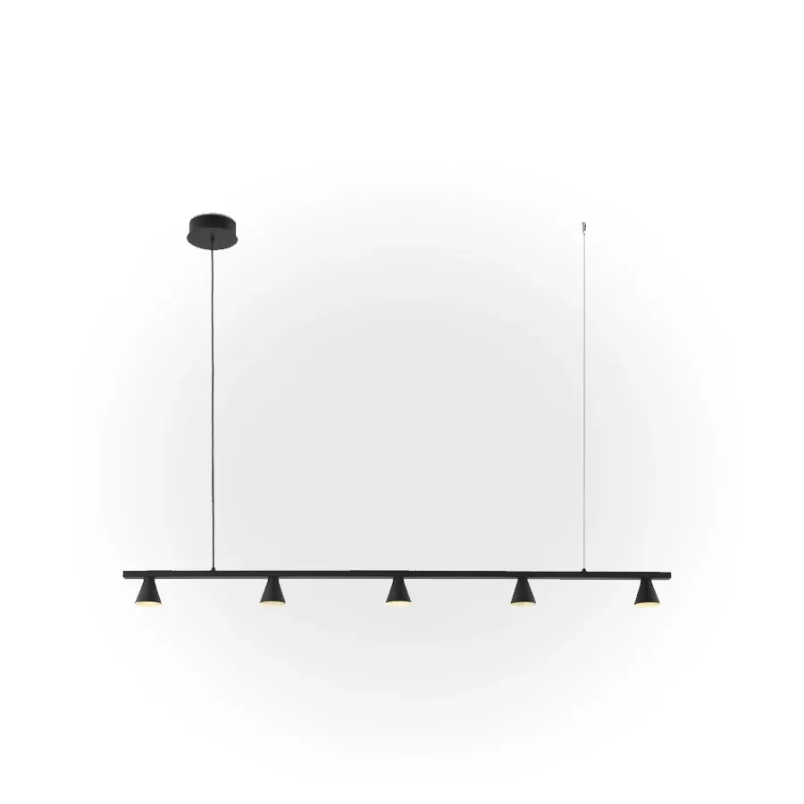 Una lámpara de techo tan ligera como actual con 5 difusores cónicos con LED integrados y dos anclajes al techo. Regulable en altura.