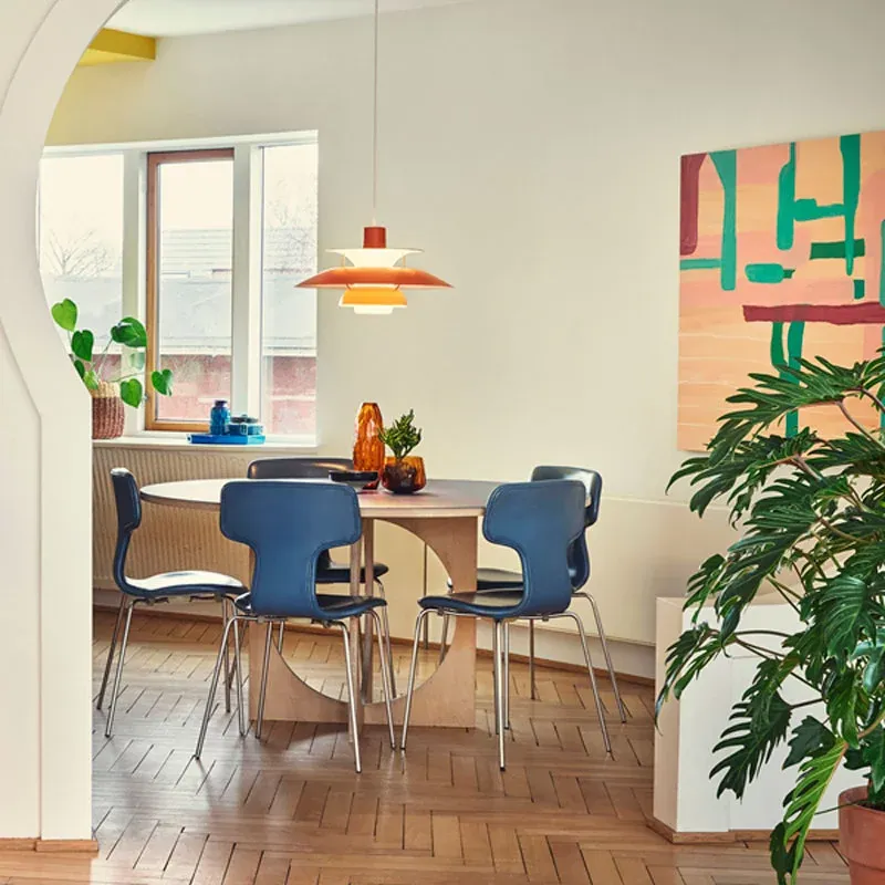 La luminaria proporciona una iluminación 100% sin deslumbramiento. En 1958, Poul Henningsen creó la lámpara PH 5, dando continuidad a su célebre sistema de tres pantallas. La luminaria proyecta tanto luz hacia abajo como luz lateral, iluminándose a sí misma. En la PH 5 Clásica, el cono rojo interior y un pequeño reflector azul aportan un tono de luz más cálido.