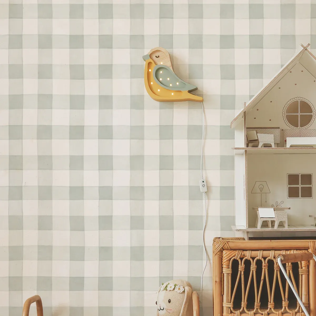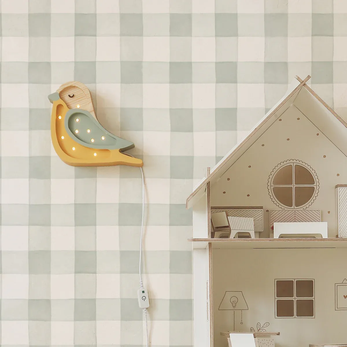 Para colgar en la pared, para adornar la mesita de noche o la estantería: la Lampara Pajarito color mostaza y turquesa pálido se puede usar de distintas maneras en la decoración del cuarto de los niños. ¡Queda ideal en todas sus versiones!