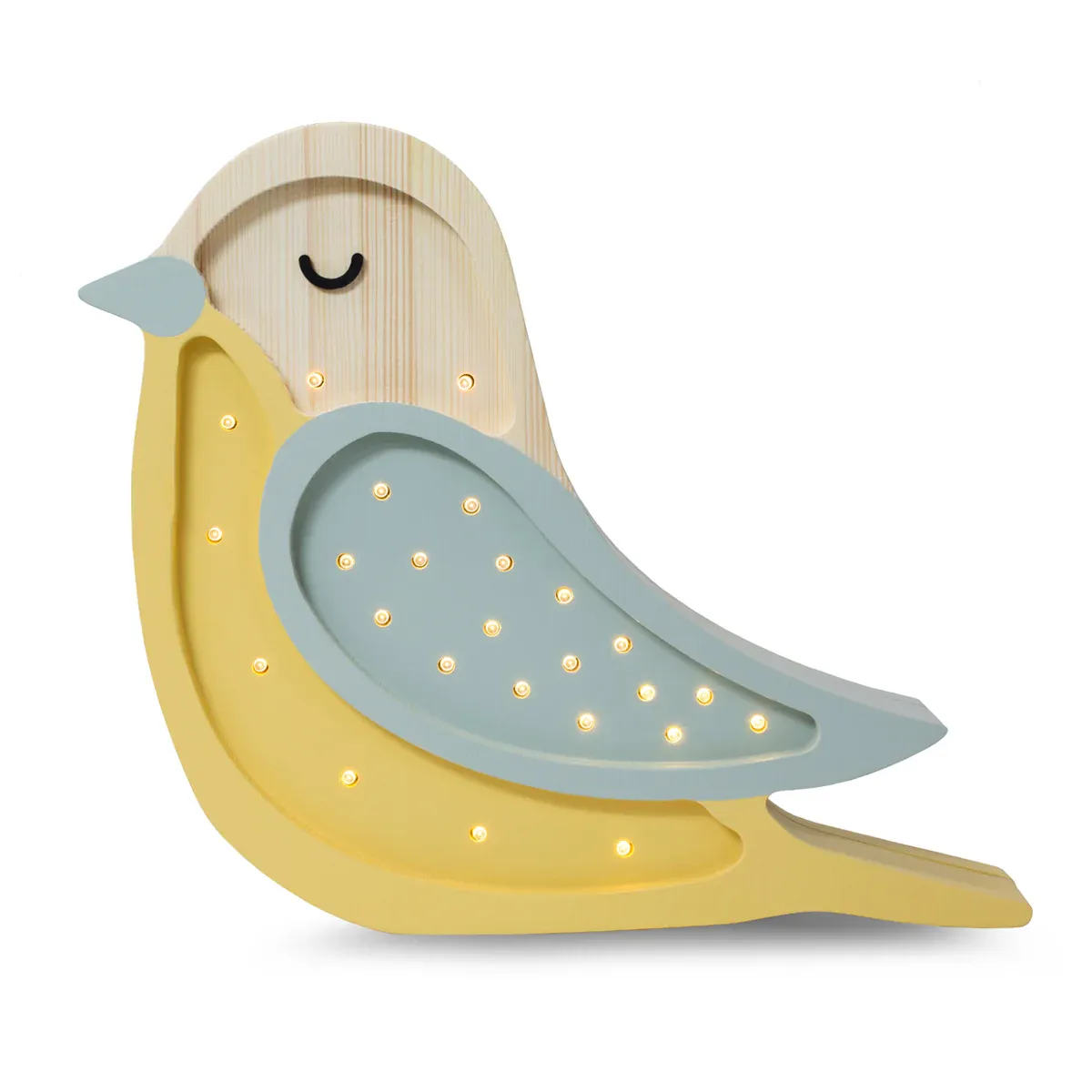 La opción de luz más fuerte de la lámpara Pajarito Mostaza es ideal para los momentos de lectura de los pequeños, mientras la más tenue es perfecta como luz de noche, proporcionando un ambiente relajado para la hora de dormir.