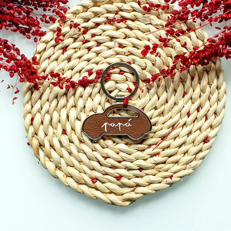 Está fabricado en cuero reciclado en color marrón, personalizado con las iniciales, nombre o palabra que quieras en color blanco. Lo mejor de todo es que puedes escribirlo con tu propia letra, con la letra de tus hijos… Solo tienes que escribir la palabra que quieras en un folio blanco y adjuntar la foto en el espacio donde indica «subir imagen» y nosotros nos encargamos de traspasarlo tal cual al llavero.