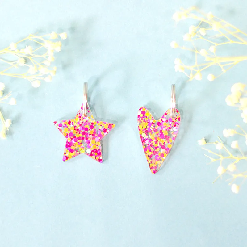 Nuestros llaveros confeti vienen cargados de alegría y color, con forma de estrella o corazón para iluminar tu día a día.