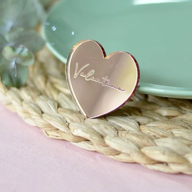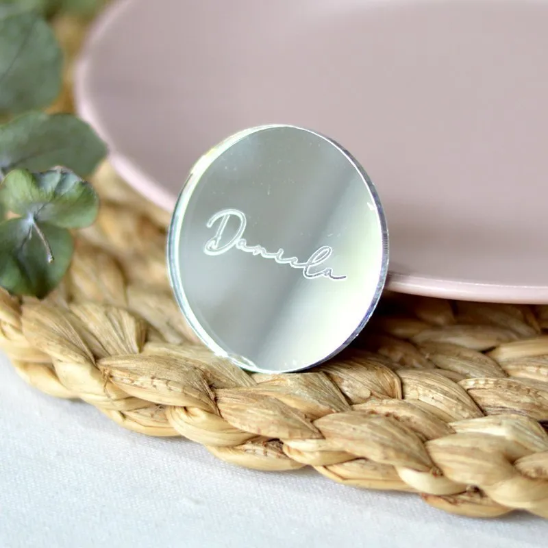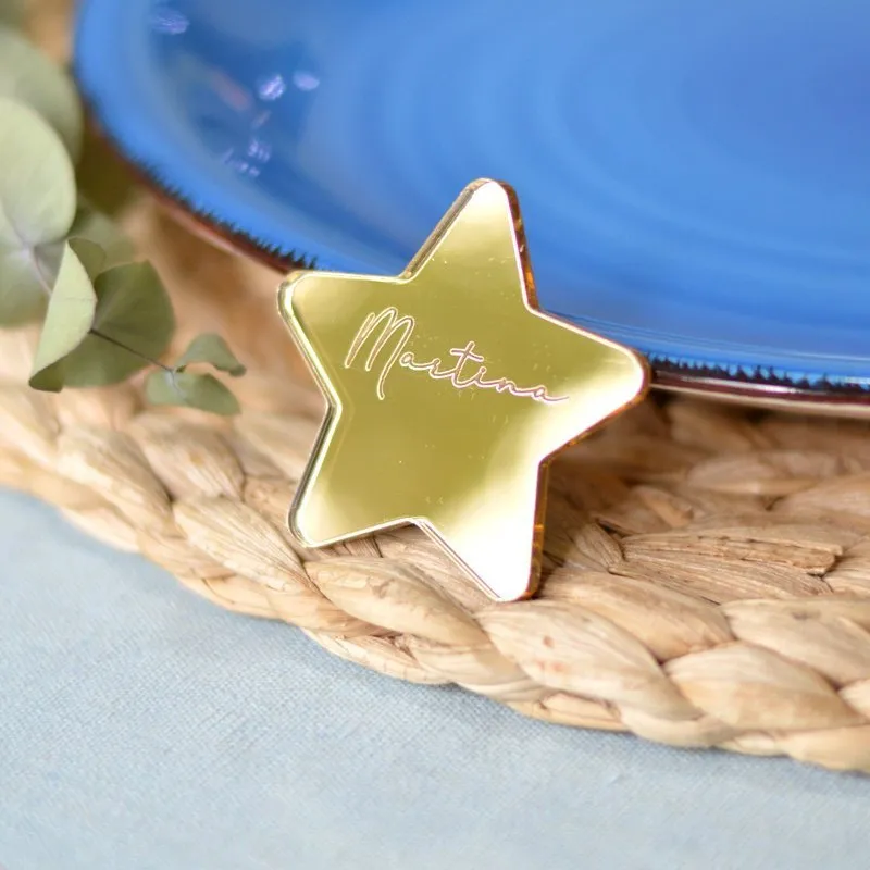 Fabricados en acrílico espejo con forma de estrella, círculo o corazón y nombre grabado con la tipografía de la imagen.