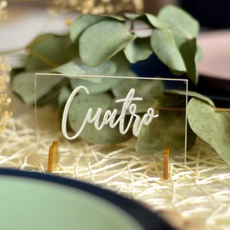 Meseros rectangulares de metacrilato transparente grabado con base de 2 patas de metacrilato de color a elegir, para marcar las mesas de tus eventos y celebraciones. Ideal para señalizar las mesas de los invitados en una boda, bautizo, comunión o cualquier evento o celebración.