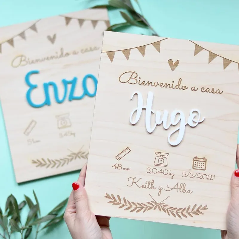El texto «Bienvenido a casa» va prediseñado en castellano, grabado sobre la madera, pero si quieres podemos cambiar esta frase para ti o ponerla en otro idioma, sólo tienes que indicarlo en el pedido. Puedes añadir, sin coste extra, la fecha del nacimiento, el peso y medida del bebé, nombre de los padres, lugar de nacimiento o cualquier dato que quieras… añadiéndola en el espacio del texto personalizado junto al nombre.