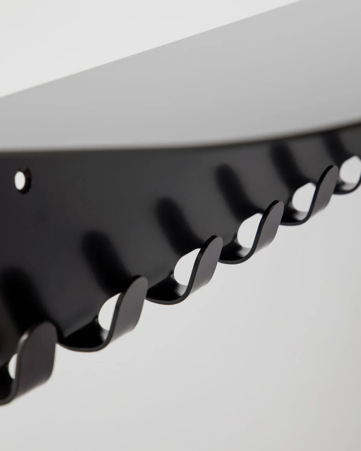 El perchero de pared Book de la marca House Doctor, fabricado en acero con un diseño contemporáneo en negro mate, ofrece un plus a las soluciones de almacenamiento gracias a su lámina horizontal que permite apoyar diferentes objetos como jabones, velas u otros. Equipado con 9 ganchos y un estante, proporciona amplio espacio para chaquetas, bolsos y otros accesorios. Su tamaño compacto lo convierte en una excelente alternativa a los colgadores y percheros de pie, ayudando a ahorrar espacio. Su capacidad máxima de carga es de 5 kg. Para su mantenimiento, se recomienda limpiarlo con un paño seco.