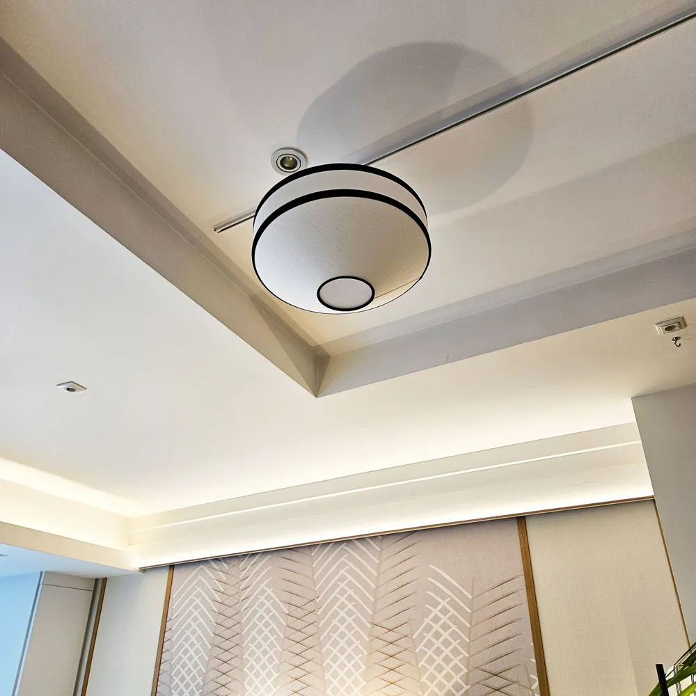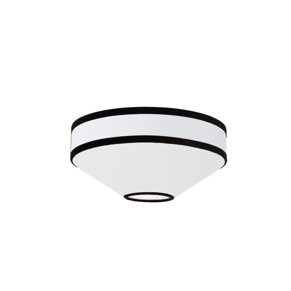 Plafón de lino blanco con vivos en negro y difusor de luz opaco.