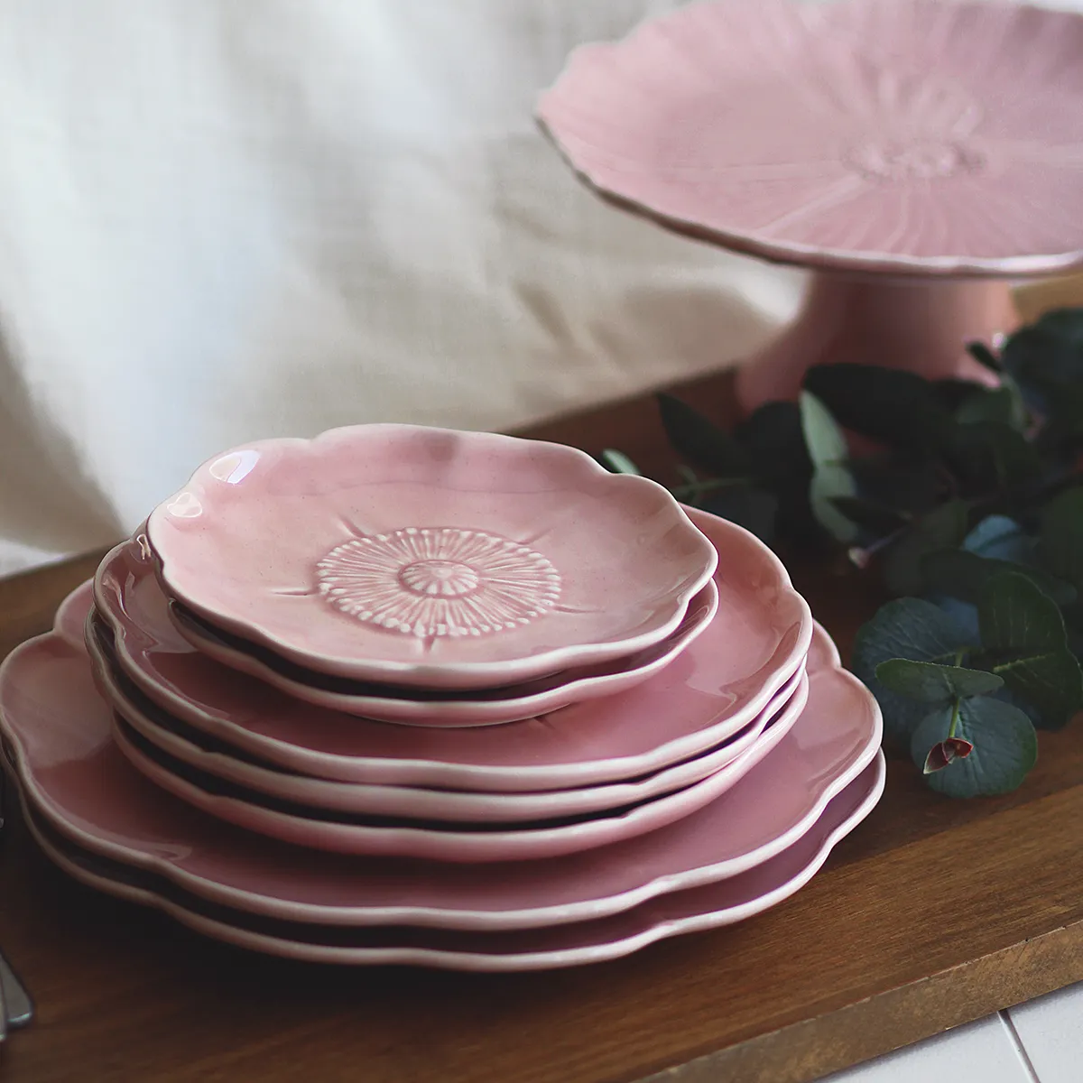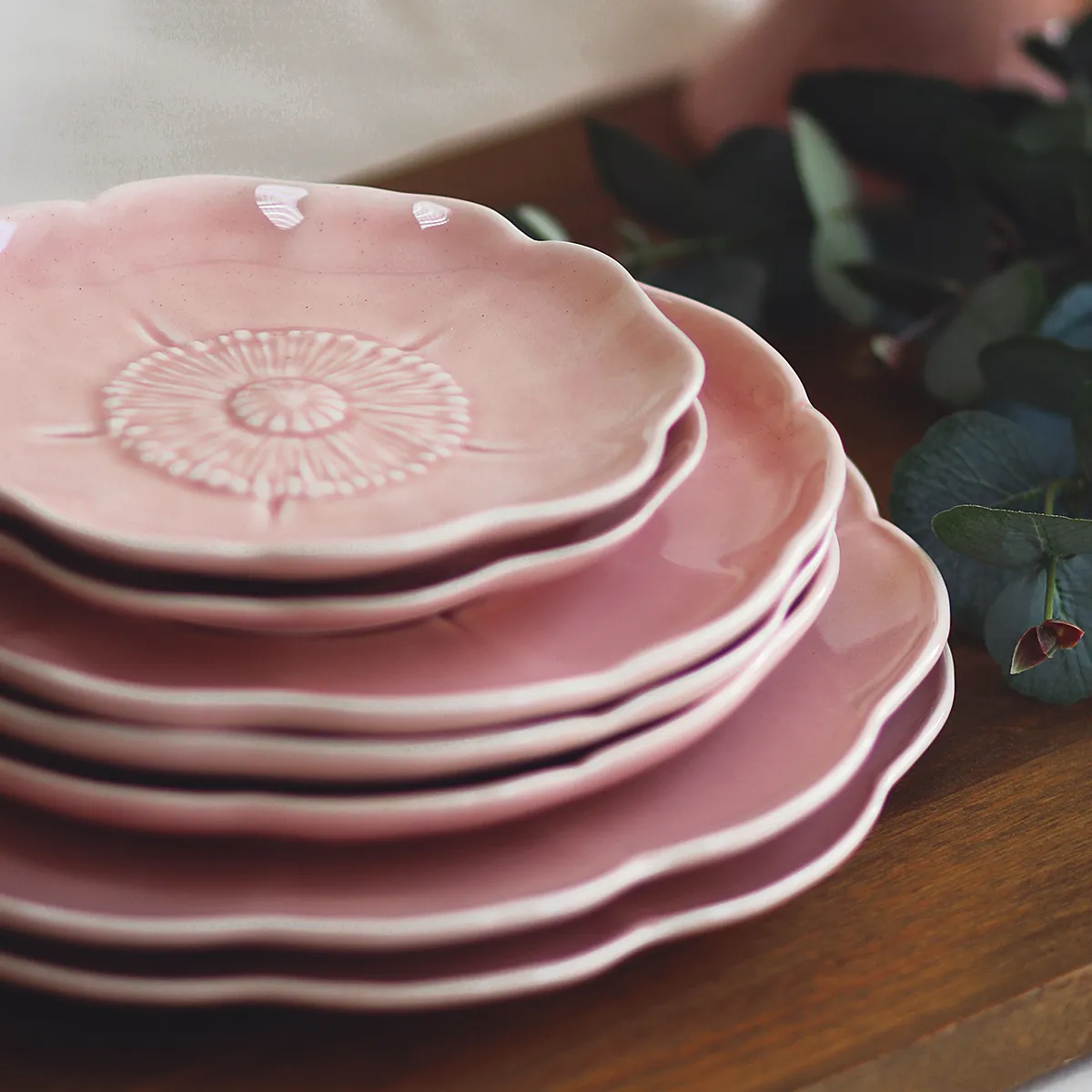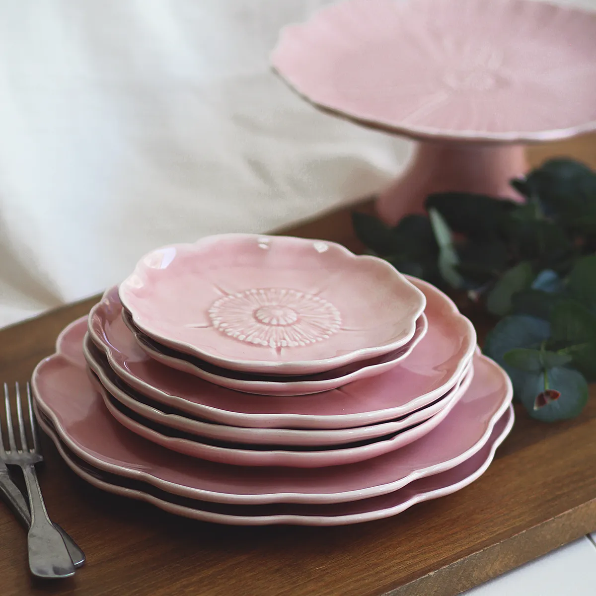 Este plato llano forma parte de un tipo de cerámica tradicional del centro de Portugal. Frutas, hortalizas y hojas son uno de los temas principales de la tradición lusa a la hora de montar una mesa. Está fabricado de manera artesanal y esmaltado a mano en color rosa. Aunque el proceso de fabricación sea tradicional está adaptado para el uso diario.