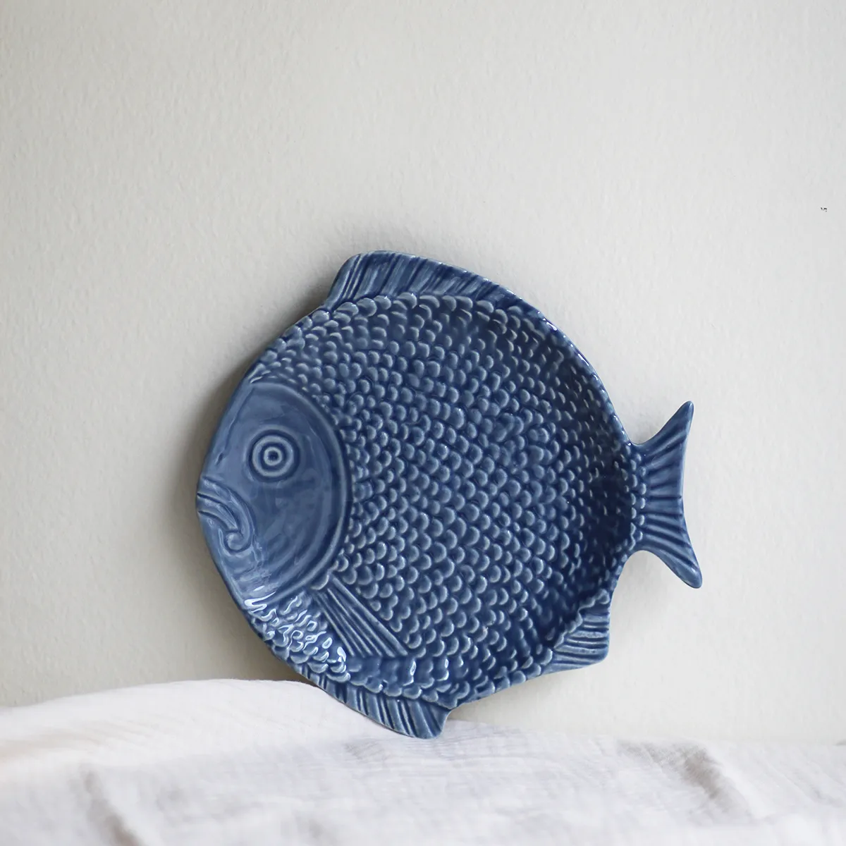 Plato postre de cerámica, fabricado y esmaltado a mano en Portugal. Este tipo de vajilla con formas es ya un símbolo tradicional del país luso y el tema marítimo está muy presente en sus mesas.