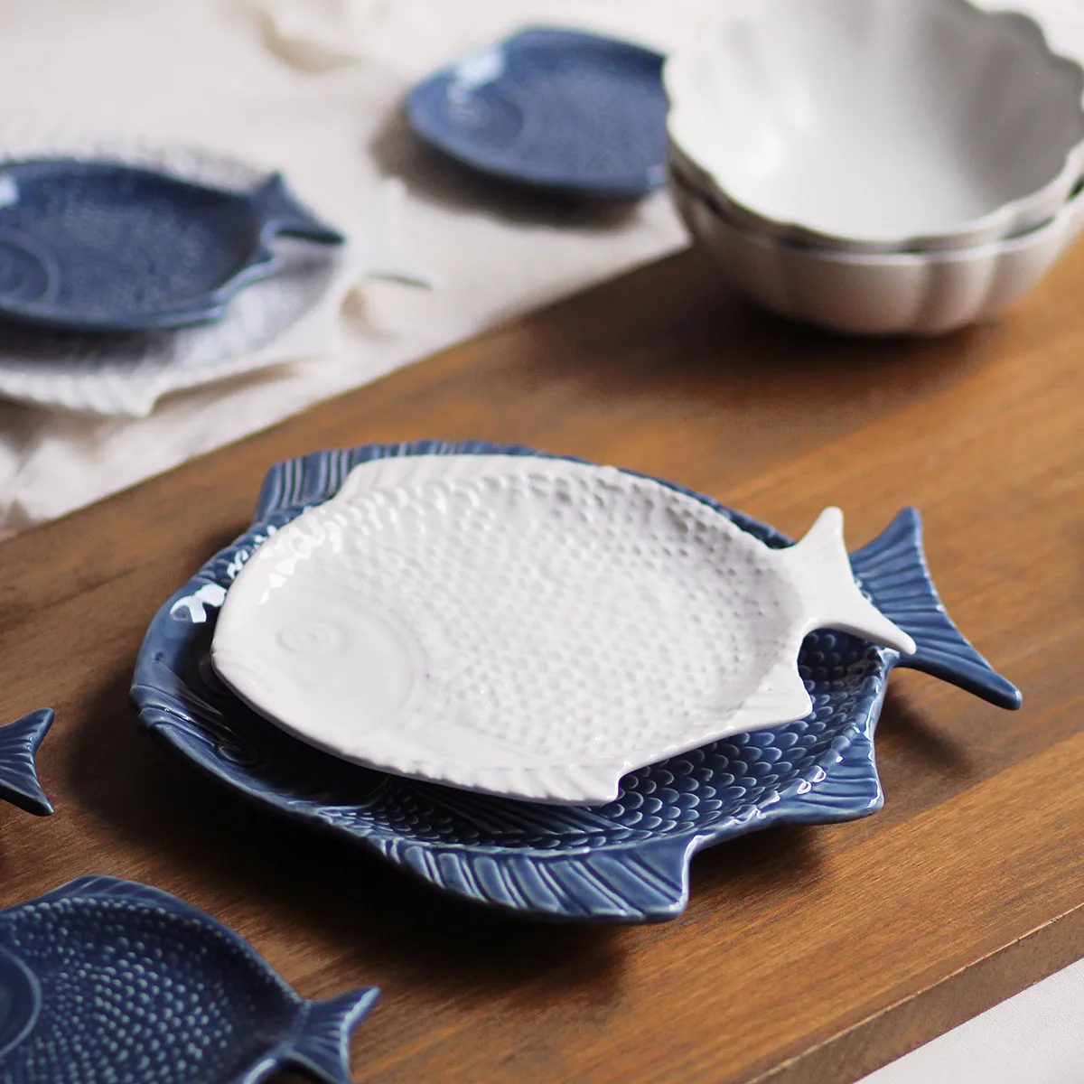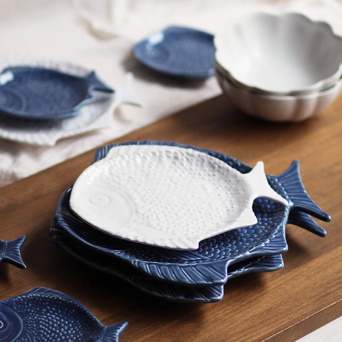 Plato postre de cerámica, fabricado y esmaltado a mano en Portugal. Este tipo de vajilla con formas es ya un símbolo tradicional del país luso y el tema marítimo está muy presente en sus mesas.