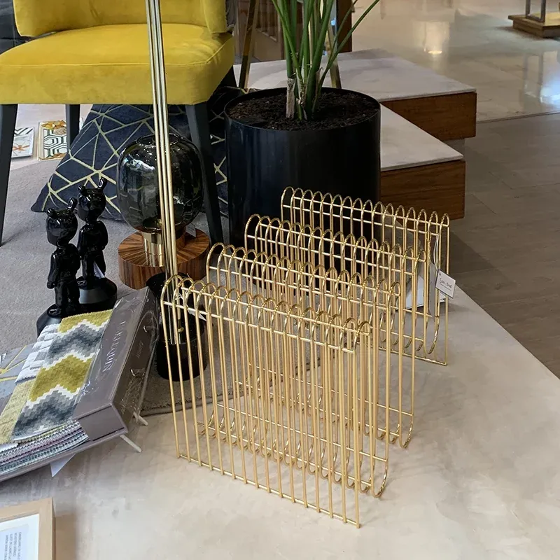 Un revistero de diseño de metal de formas sinuosas y línea moderna.
